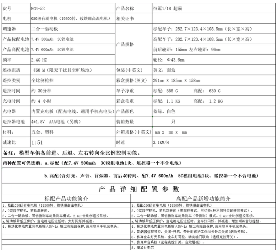 ✿AREA.TOY✿ 恆冠 HG4-52 1:18 遙控模型車 正版授權 豐田 超霸 四驅轉向 帶燈光聲組 發煙