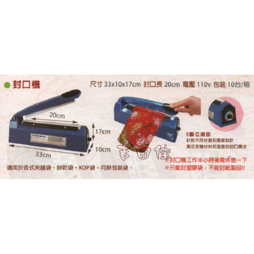 【注意事項】: 使用前請務必閱讀說明書 使用30分鐘後,請停機休息一下再使用 只能封塑膠袋,不能封紙袋。 建議使用後清洗封口線