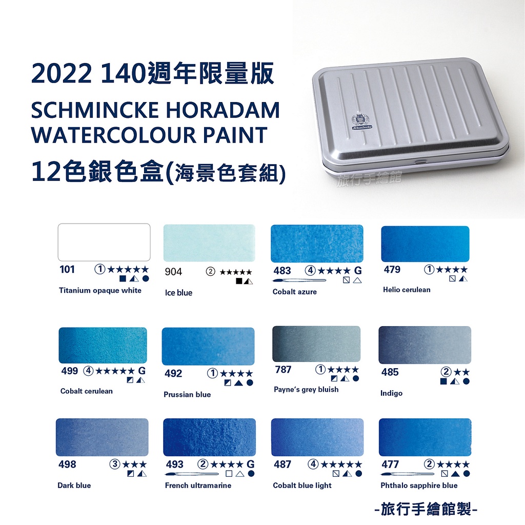 海景12色裡含有3個等級4顏料,一個限量版(Ice Blue)