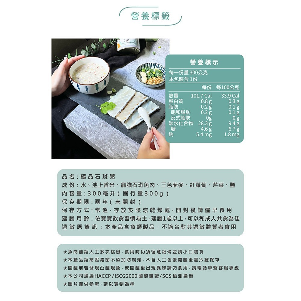 成分:水、池上香米、龍膽石斑魚肉、三色藜麥、紅蘿蔔、芹菜、鹽