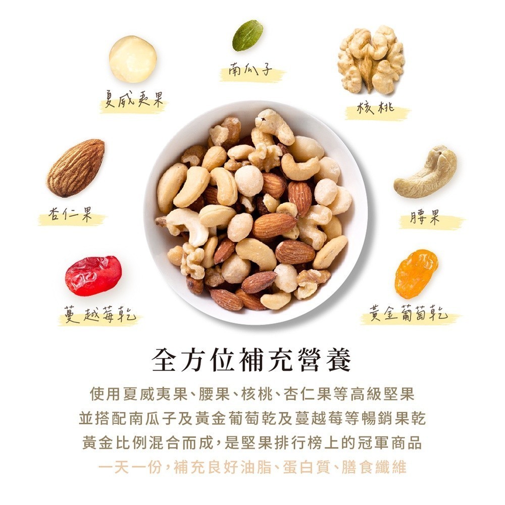 成分:黃金葡萄乾(葡萄乾、亞硫酸鈉)、蔓越莓(蔓越莓、糖、葵花油)、核桃、杏仁果、夏威夷果、腰果、南瓜子