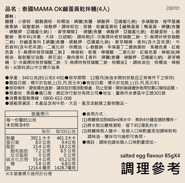 麵體:小麥粉、醋酸澱粉、棕櫚油、碘鹽(食鹽、碘酸鉀、亞鐵氰化鈉)、多磷酸鈉、羧甲基纖維素鈉、碳酸氫鈉、碳酸鉀。調味粉包:蔗糖、乾鹹蛋黃粉【鹹鴨蛋黃〔鴨蛋黃、碘鹽(食鹽、碘酸鉀、亞鐵氰化鈉)〕、麥芽糊精】、碘鹽(食鹽、碘酸鉀、亞鐵氰化鈉)、乾雞蛋粉、L-麩酸鈉、香辛料(洋蔥、大蒜、白胡椒)、調味劑(5'-次黃嘌呤核苷磷酸二鈉、5'-鳥嘌呤核苷磷酸二鈉)、炒鹹蛋香料【碘鹽(食鹽、碘酸鉀、亞鐵氰化鈉)、麥芽糊精、香料(含大豆來源)、牛奶香料(含牛奶來源)、二氧化矽、棕櫚油、L-麩酸鈉、辛烯基丁二酸鈉澱粉、焦糖色素、紅椒色素、5'-鳥嘌呤核苷磷酸二鈉】、辣椒粉、乾蔥、檸檬酸、二氧化矽、紅椒色素、辣椒油(辣椒油、脂肪酸甘油酯、葵花油)、雞肉香料【香料、碘鹽(食鹽、碘酸鉀、亞鐵氰化鈉)、麥芽糊精、5'-次黃嘌呤核苷磷酸二鈉、5'-鳥嘌呤核苷磷酸二鈉、棕櫚油】。調味油包:棕櫚油、辣椒粉。