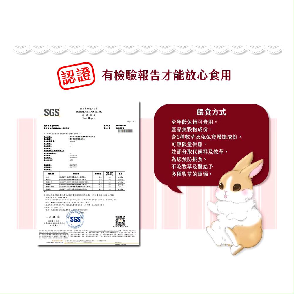 成分:95%牧草(提摩西、甜燕麥、小麥草、果園草、狼尾草、黑麥草)、蘋果纖維、小球藻、兔兔疫力佳、車前草萃取物