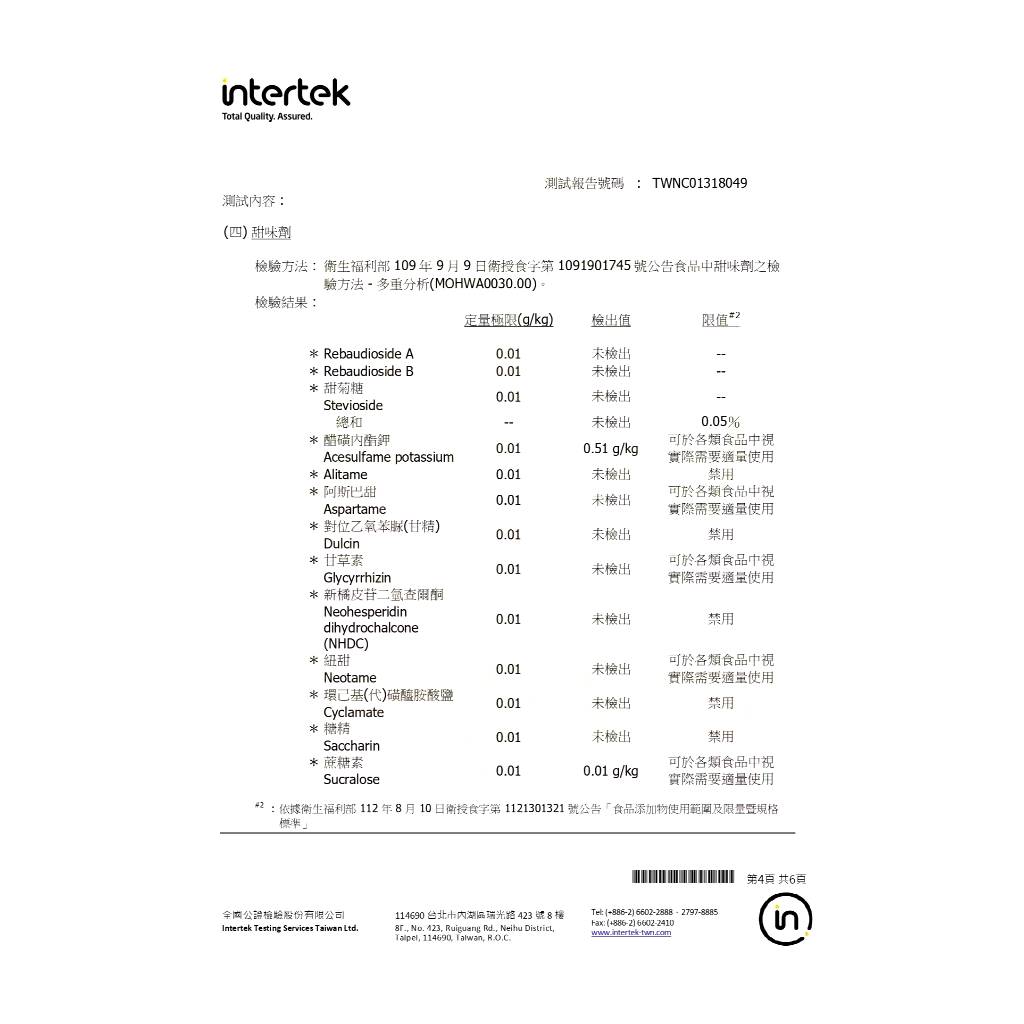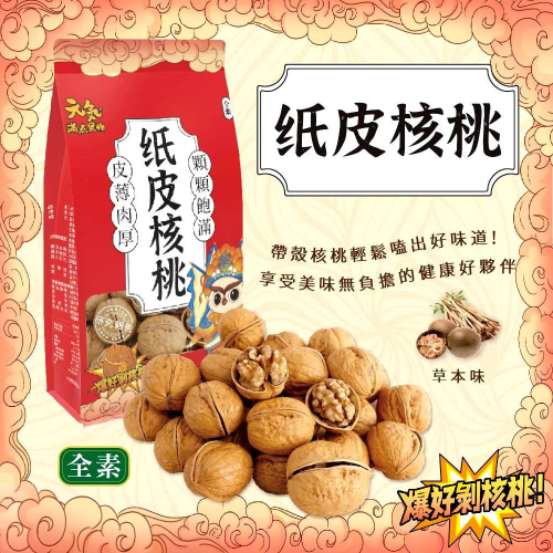 成份:核桃、食鹽、砂糖、醋磺內酸鉀(甜味劑)、蔗糖素(甜味劑)、紐甜(甜味劑)、木瓜蛋白醇、L-麩酸鈉、草本萃取物(水、羅漢果、甘草)、香料
