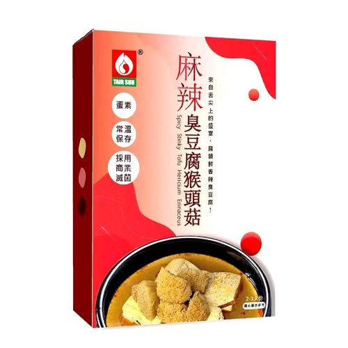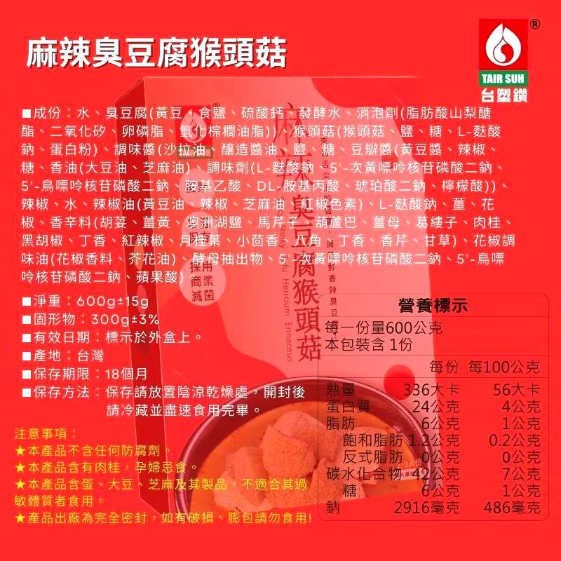 ■成份:水、臭豆腐(黃豆、食鹽、硫酸鈣、發酵水、消泡劑(脂肪酸山梨醣酯、二氧化矽、卵磷脂、氫化棕櫚油脂))、猴頭菇(猴頭菇、鹽、糖、L-麩酸鈉、蛋白粉)、調味醬(沙拉油、釀造醬油、鹽、糖、豆瓣醬(黃豆醬、辣椒、糖、香油(大豆油、芝麻油)、調味劑(L-麩酸鈉、5'-次黃嘌呤核苷磷酸二鈉、5'-鳥嘌呤核苷磷酸二鈉、胺基乙酸、DL-胺基丙酸、琥珀酸二鈉、檸檬酸))、辣椒、水、辣椒油(黃豆油、辣椒、芝麻油、紅椒色素)、L-麩酸鈉、薑、花椒、香辛料(胡荽、薑黃、澳洲湖鹽、馬芹子、葫蘆巴、薑母、葛縷子、肉桂、黑胡椒、丁香、紅辣椒、月桂葉、小茴香、八角、丁香、香芹、甘草)、花椒調味油(花椒香料、芥花油)、酵母抽出物、5'-次黃嘌呤核苷磷酸二鈉、5'-鳥嘌呤核苷磷酸二鈉、蘋果酸)。
