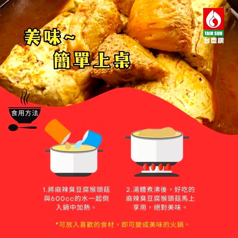 香辣微麻,搭配特選發酵臭豆腐、優質猴頭菇,滿滿紮實的用料,只要倒入鍋中加水加熱,就能馬上吃到香辣帶麻,又臭到難忘的美味麻辣臭豆腐。