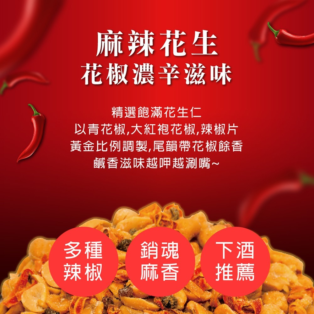 成分:花生、棕櫚油(棕櫚油、複方抗氧化劑(丙二醇、抗氧化劑-第三丁基氫醌、無水檸檬酸)﹞、辣椒片、蔥片、鹽(鹽、亞鐵氫化鉀)、芝麻油、味美A(胺基乙酸、胺基丙酸、味精、5'-次黃嘌呤核苷磷酸二鈉、5'-鳥嘌呤核苷磷酸二鈉、琥珀酸二鈉、檸檬酸鈉)、蒜粉(蒜頭、玉米澱粉、二氧化矽)、辣椒粉、水性花椒樹脂精油(聚山梨醇酐脂酸脂八十、花椒萃取物、丙二醇)、甘草、油性辣椒精(葵花油、脂肪酸山梨醇酐脂、辣椒萃取物)、油性辣椒紅(葵花油、紅椒萃取物)、大蒜精油(大蒜萃取物、芥花油)、阿斯巴甜(甜味劑)、三星蔥粉
