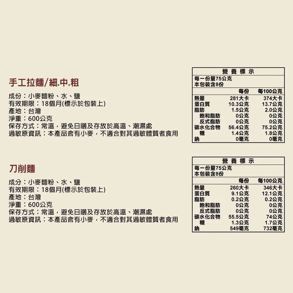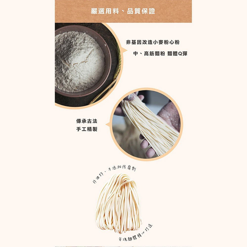 手工麵成份:小麥麵粉、水、鹽