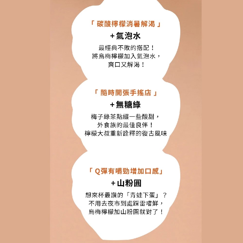 烏梅檸檬風味,結合傳統烏梅與新鮮檸檬,口感獨特回甘