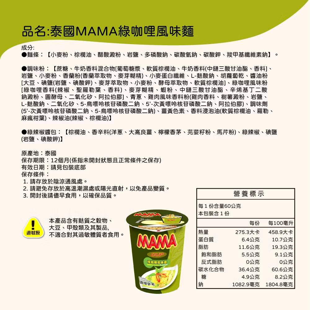 調味粉:【蔗糖、牛奶香料混合物[葡萄糖漿、軟質棕櫚油、牛奶香料(中鏈三酸甘油酯、香料]、岩鹽、小麥粉、香蘭粉(香蘭萃取物、麥芽糊精)、小麥蛋白纖維、L-麩酸鈉、胡蘿蔔乾、醬油粉[大豆、碘鹽(岩鹽、碘酸鉀)、麥芽萃取物、小麥粉、酵母萃取物、軟質棕櫚油]、綠咖哩風味粉[綠咖哩香料(辣椒、聖羅勒葉、香料)、麥芽糊精、蝦粉、中鏈三酸甘油酯、辛烯基丁二酸鈉澱粉、圓酵母、二氧化矽、阿拉伯膠]、青蔥、雞肉風味香料粉(雞肉香料、樹薯澱粉、岩鹽、L-麩酸鈉、二氧化矽、5-鳥嘌呤核苷磷酸二鈉、5'-次黃嘌呤核苷磷酸二鈉、阿拉伯膠)、調味劑(5'-次黃嘌呤核苷磷酸二鈉、5-鳥嘌呤核苷磷酸二鈉)、薑黃色素、香料浸泡油(軟質棕櫚油、羅勒、麻瘋柑葉)、辣椒油(辣椒、棕櫚油)】
