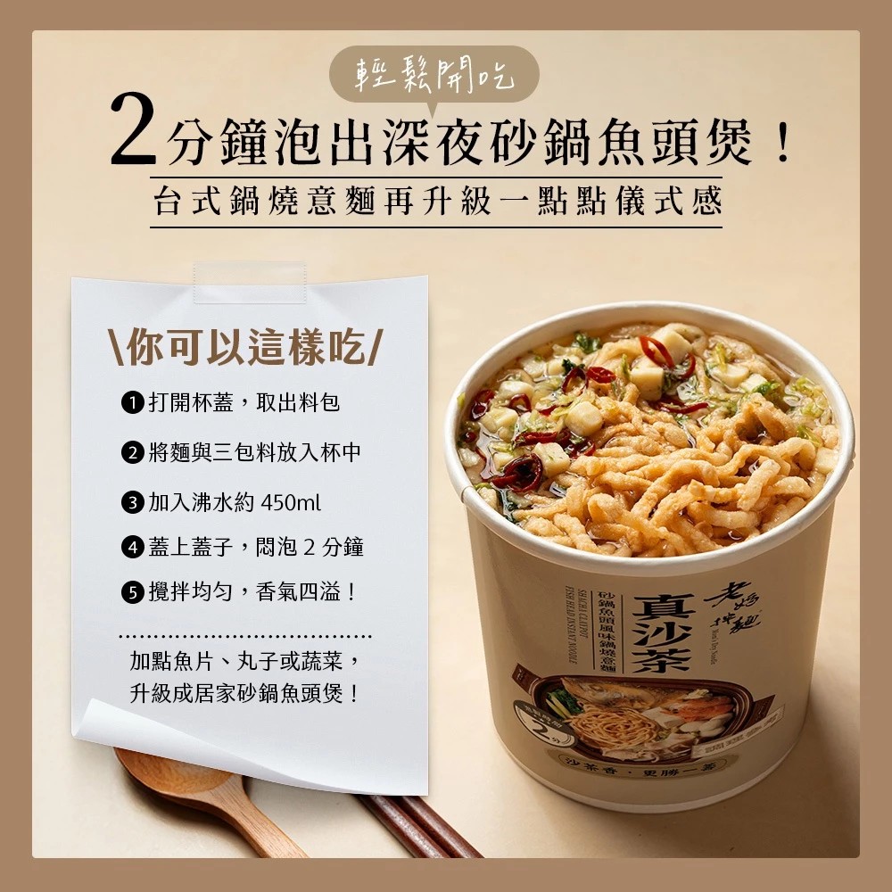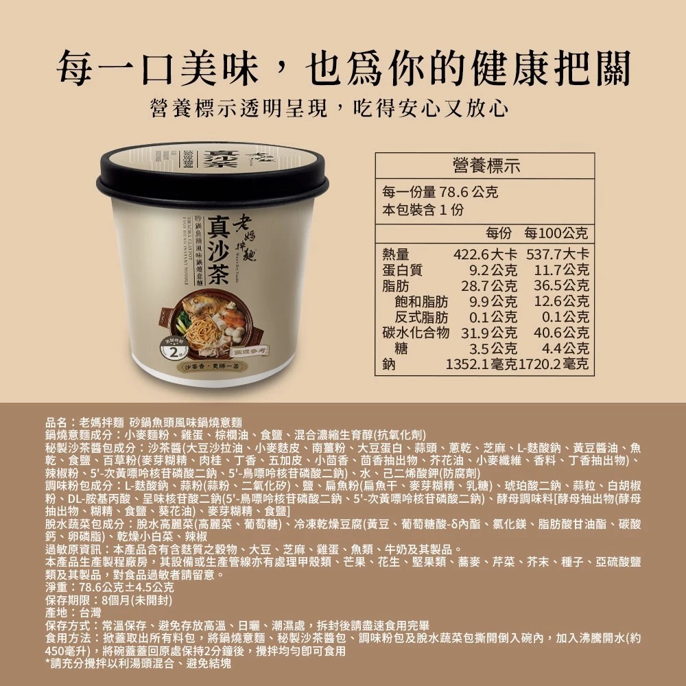 【老媽拌麵 真沙茶】嚴選百年潮汕沙茶工藝,搭配砂鍋魚頭湯頭風味,還原經典台灣鍋燒的濃郁海味。