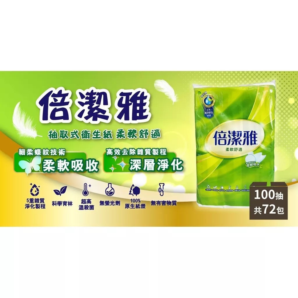 倍潔雅-柔軟舒適 抽取式衛生紙100抽x6包X12串/箱
