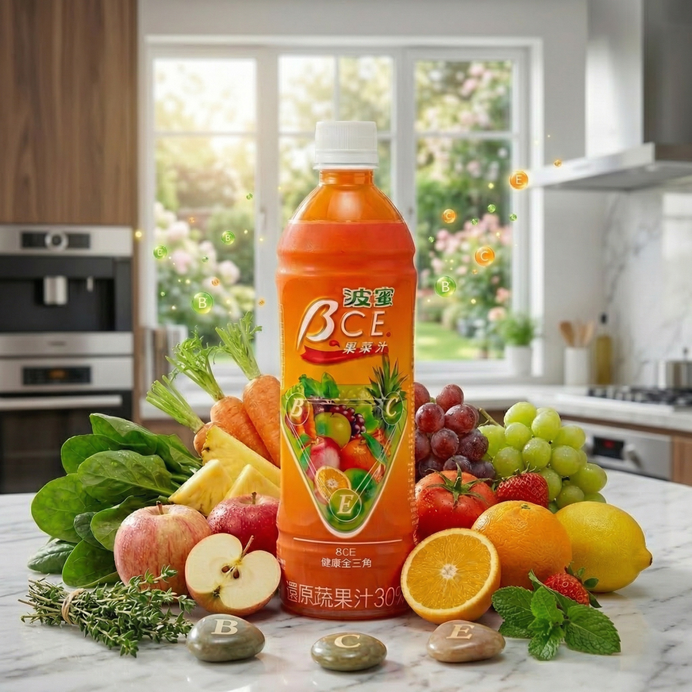成分:水、砂糖、紅蘿蔔濃縮汁、白葡萄濃縮汁、鳳梨濃縮汁、蘋果濃縮汁、柳橙濃縮汁、芹菜濃縮汁、果糖、羧甲基纖維素鈉、維生素C、香料、檸檬酸、維生素E、檸檬濃縮汁、菠菜汁