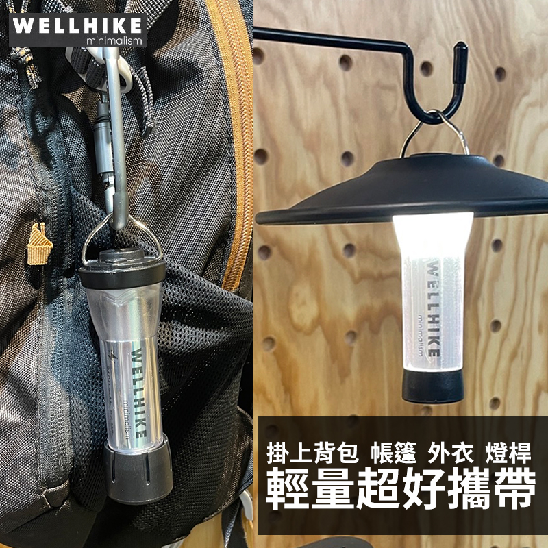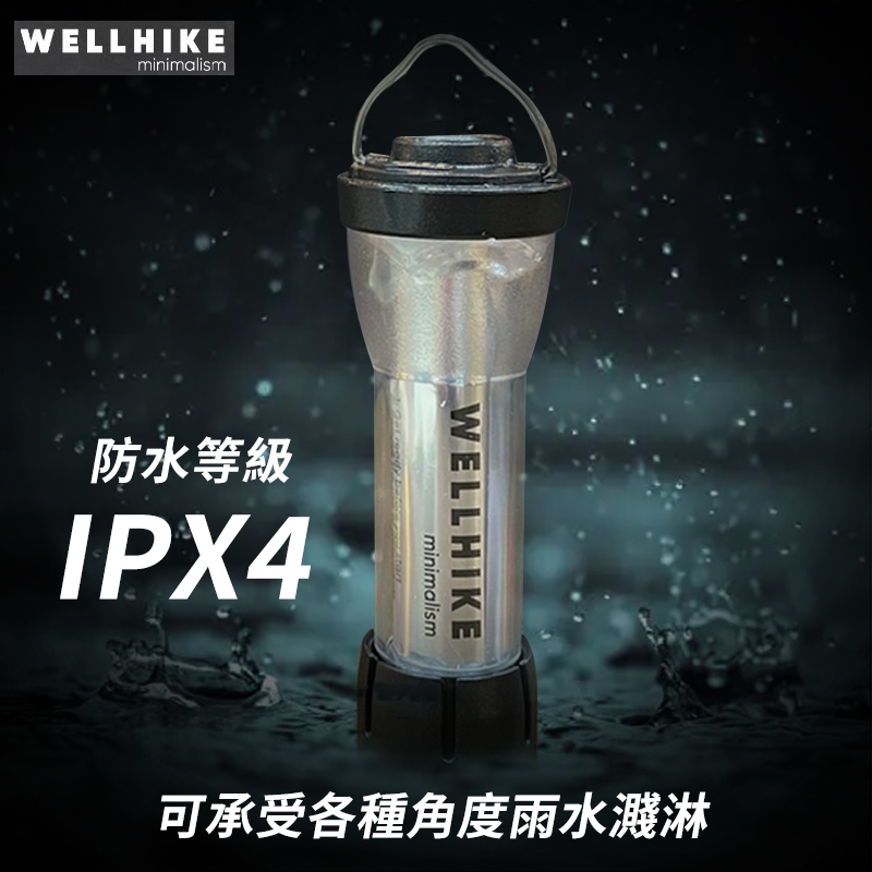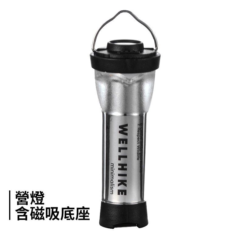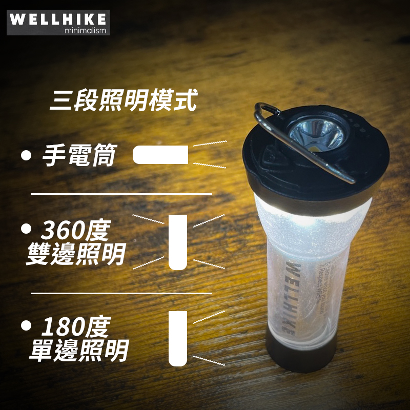 三段光源分別為手電筒(120LM)、360度營燈模式、180度營燈模式(150LM),任一模式下長按電源即控制光亮程度