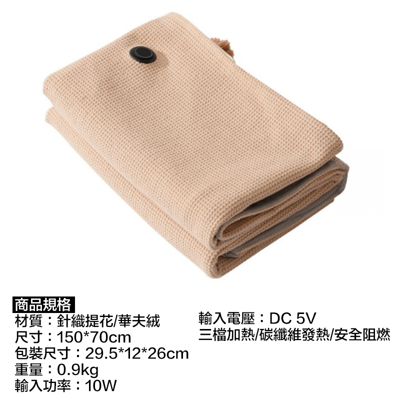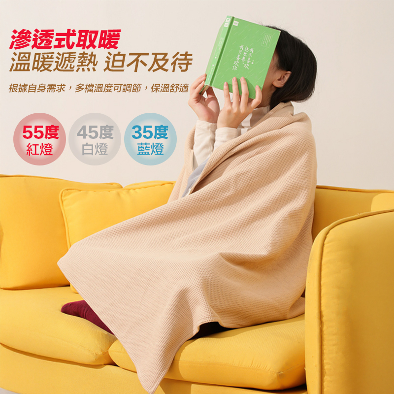 USB供電加熱功能,使用支援5V2A行動電源即可自由加溫,三檔溫度設置(藍燈35°C、白燈45°C、紅燈55°C ),根據周圍溫度需求調節,鈕扣設計讓毯子秒變披肩,穿在身上行走活動都不易掉落鎖住溫暖
