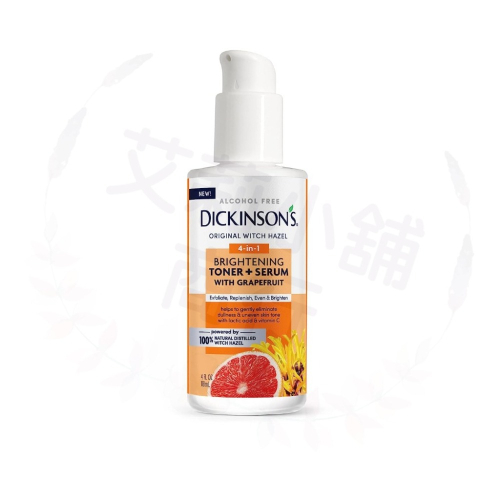 Dickinson's 亮膚爽膚水+精華液(含葡萄柚)是一款不含酒精的四合一護膚產品,能夠去角質、爽膚、保濕和滋養肌膚。本產品配方蘊含100%天然蒸餾金縷梅萃取、乳酸、維生素C和葡萄柚萃取物,溫和去角質,煥活肌膚,讓肌膚更光滑柔嫩,容光煥發。本產品採用「從植物到瓶裝」工藝精製而成,採用可持續採摘的金縷梅蒸餾而成,純淨高效。本產品不含色素、硫酸鹽、對羥基苯甲酸酯、鄰苯二甲酸酯和麩質,性質溫和,適合所有膚質的日常使用。