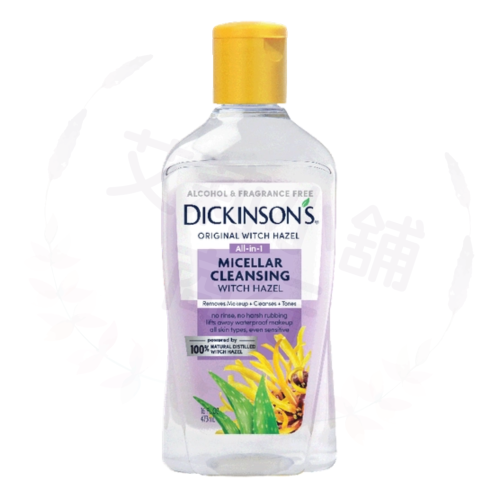 Dickinson's Micellar Cleansing Witch Hazel 是一款集卸妝、潔面和爽膚於一體的多功能產品,能夠有效去除污垢、油脂和彩妝,包括防水彩妝。蘊含 100% 天然蒸餾金縷梅,能淨化並細緻毛孔,且不會使肌膚過度乾燥。這款無酒精配方溫和無刺激,適合所有膚質的日常使用。