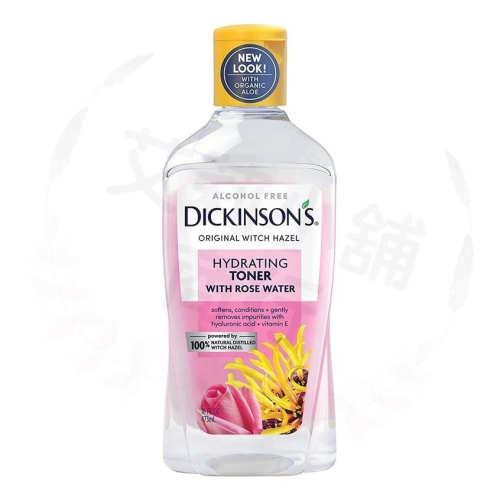 Dickinson's 玫瑰水保濕爽膚水,不含酒精,能夠清潔並細緻毛孔,舒緩和滋潤肌膚。這款爽膚水蘊含 100% 天然蒸餾金縷梅、玻尿酸、蘆薈和維生素 E,溫和滋養和保濕,即使是敏感肌膚也能使用。不含色素、硫酸鹽、對羥基苯甲酸酯、鄰苯二甲酸鹽和麩質。