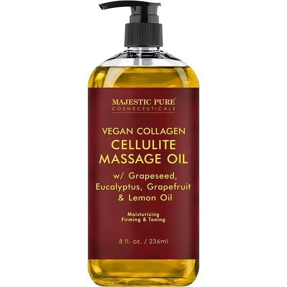 Majestic Pure Natural Cellulite Massage Oil, an active blend of oils that is easily absorbed by the skin reduces the appearance of cellulite. It smooths and firms and leaves the skin looking noticeably young and supple. It has detoxifying properties and promotes clean, radiant, and smooth skin.