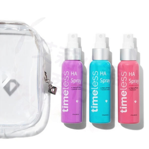 煥活、補水、煥發光彩-我們限量版迷你胜肽保濕噴霧套裝,蘊含玻尿酸和Matrixyl® 3000胜肽,能夠深層補水,促進膠原蛋白生成,提升肌膚彈性。這款經TSA認證的2盎司噴霧小巧便攜,是您理想的旅行伴侶,無論您身在何處,都能保持肌膚滋養、清爽、煥發光彩。此外,套裝還附贈專屬Timeless護膚包,方便收納,時尚便捷!