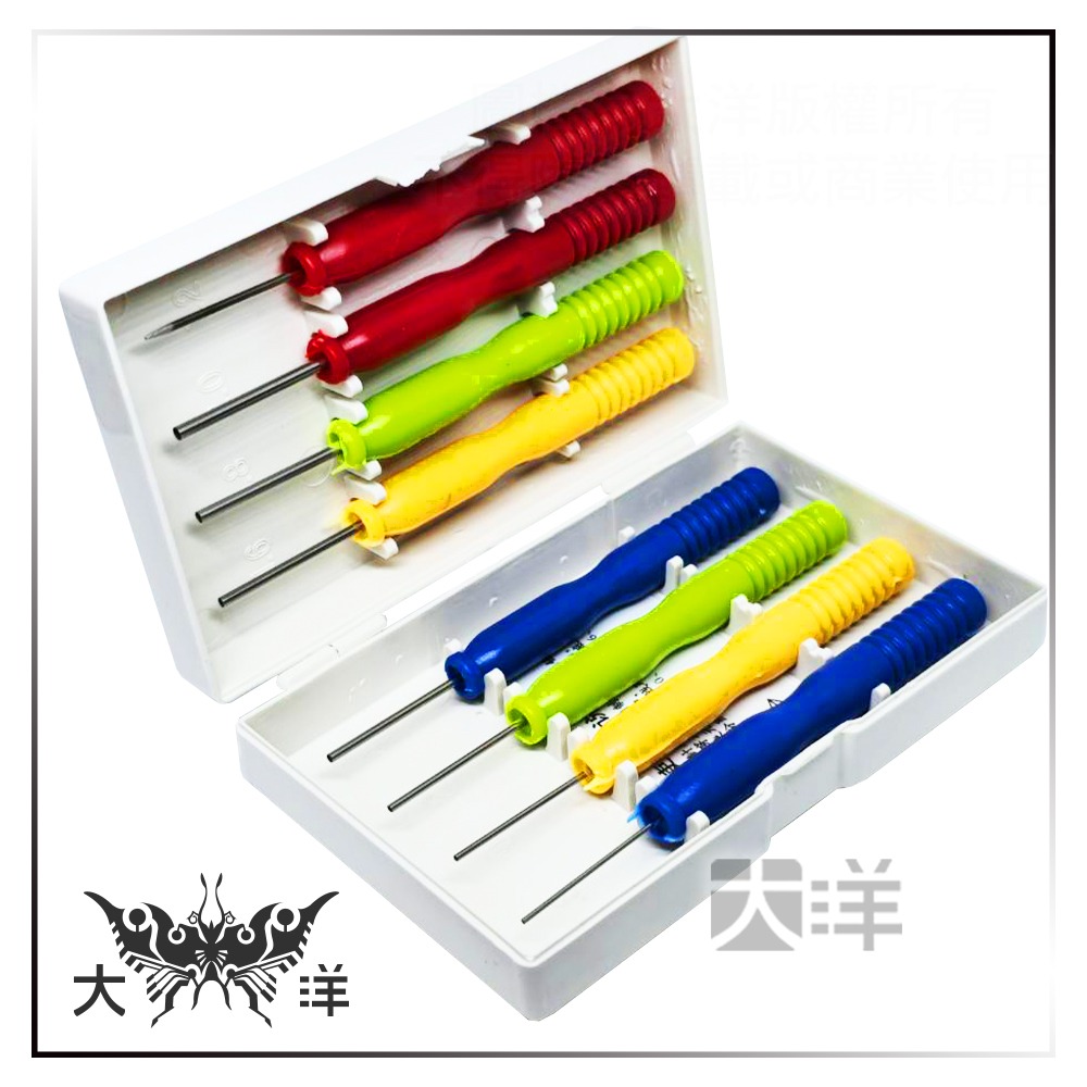 一盒八支裝,手柄管徑分別為:0.8、1.0、1.2、1.4、1.6、1.8、2.0MM+1支尖頭針。