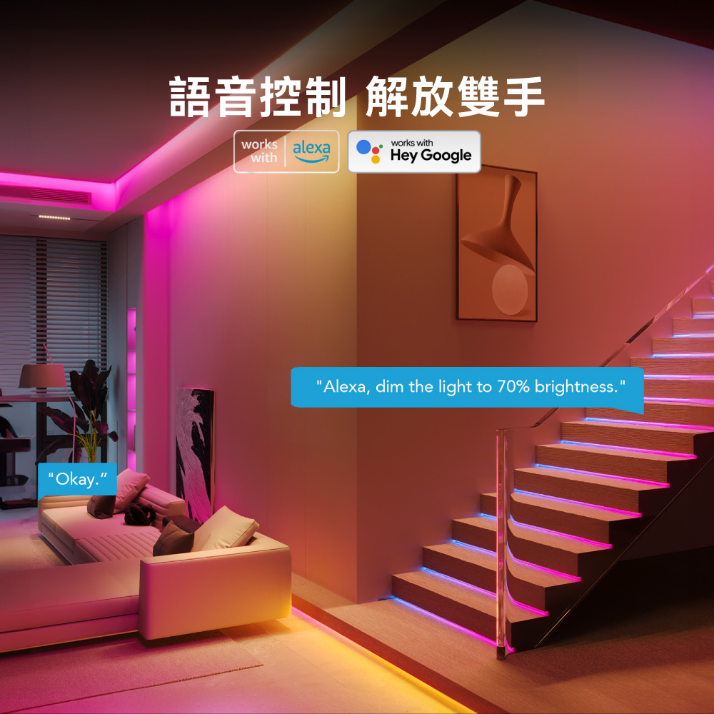 ☆ 語音控制:兼容 Matter、Google Assistant 和 Alexa,可透過語音輕鬆調整燈光,營造適合心情與活動的夢幻環境!