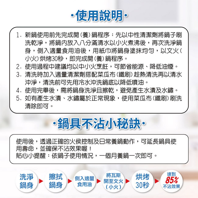 請勿用強酸強鹼清洗鍋面,例如小蘇打,以避免損壞保護層