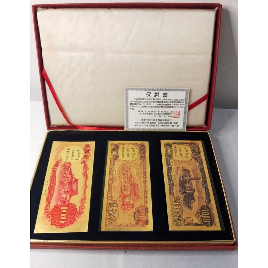 中華民國84年首屆民選正副總統黃金紀念鈔 套組含壹仟圓/伍佰圓/壹佰圓各1張,保證書1張 純金9999, 本商品由金箔打造, 三省堂監製 依保證書上所述, 含金量達97% 為24k弱 老物件, 微有歲月的痕跡!! 請審慎決定, 無法接受者請勿下單! 如有任何問題, 請私訊聊聊!! 不介意者再下標!!