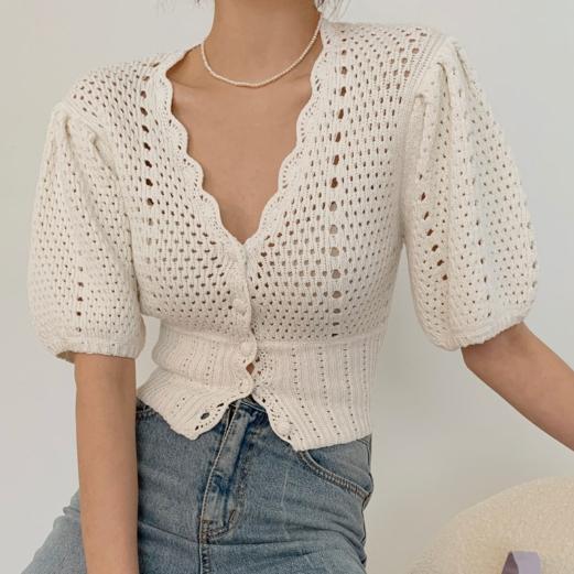 LYS - 溫柔氣質V領單排扣收腰短款泡泡袖針織衫上衣