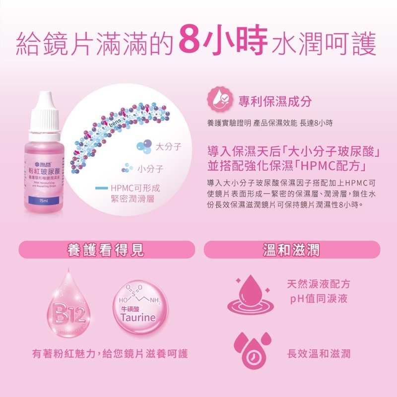 導入大小分子玻尿酸保濕因子搭配加上HPMC可使鏡片表面形成一緊密的保濕層、潤滑層,鎖住水份長效保濕滋潤鏡片可保持鏡片潤濕性8小時。
