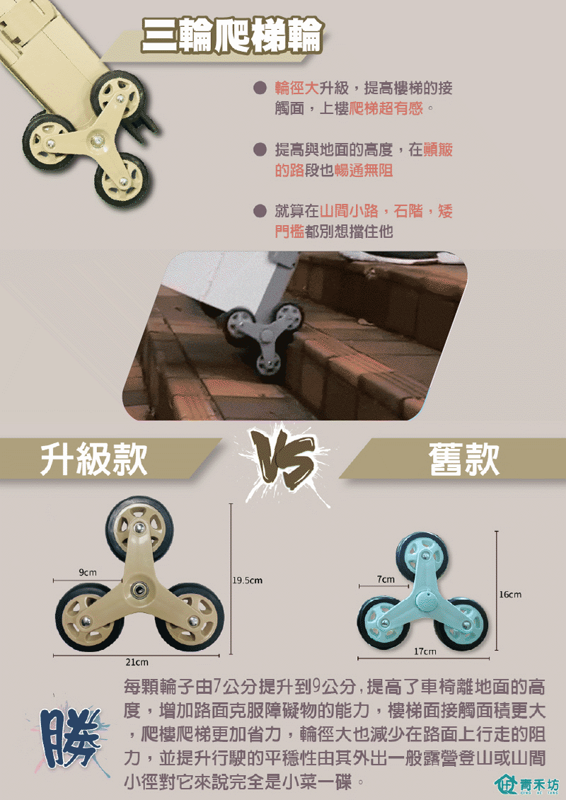 •  輪徑大升級,提高樓梯的接觸面,上樓爬梯超有感