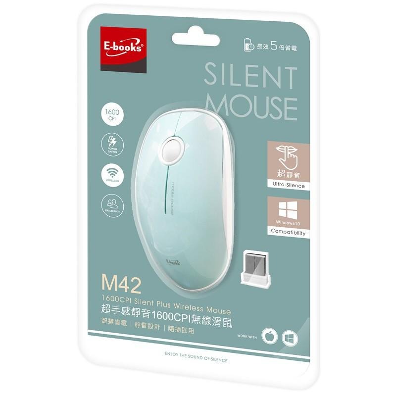 E-books 超手感靜音1600CPI無線滑鼠(白藍) M42
