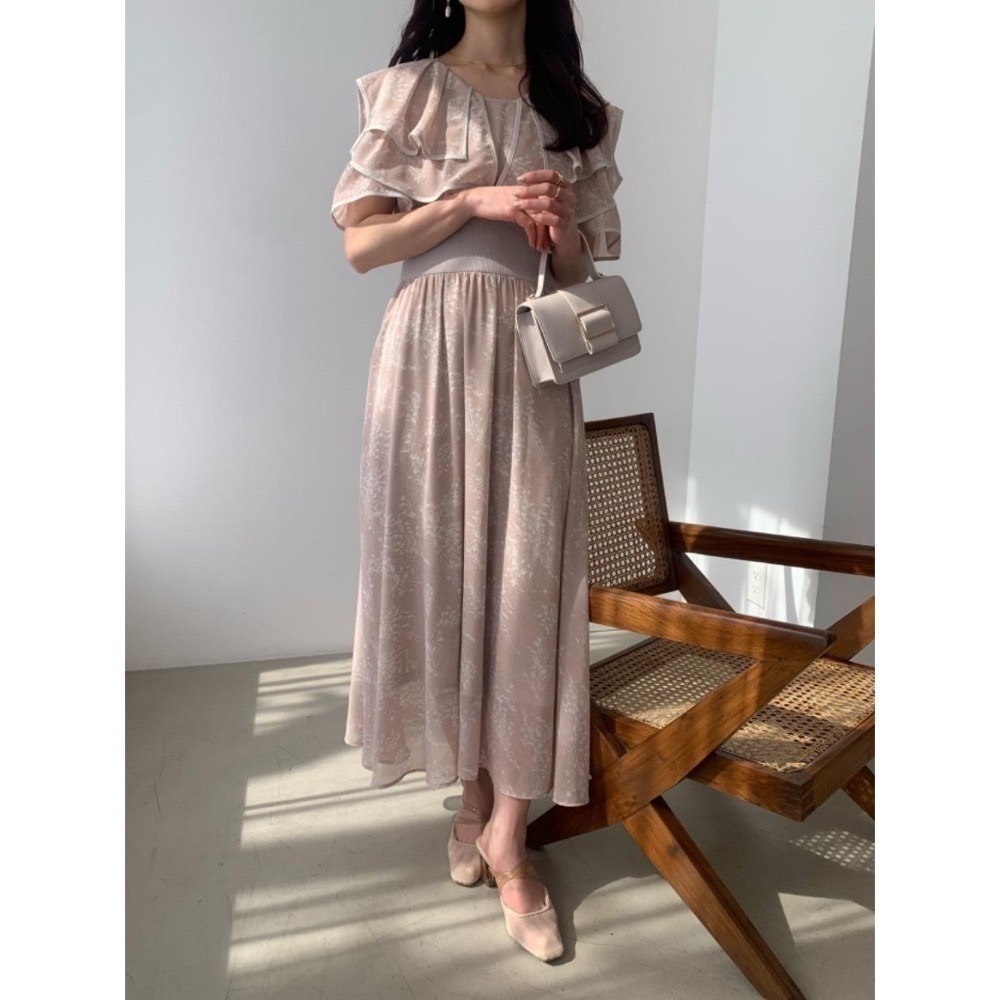 大きなフリルから覗くデコルテラインと肩の肌みせが大人あざとさを演出。