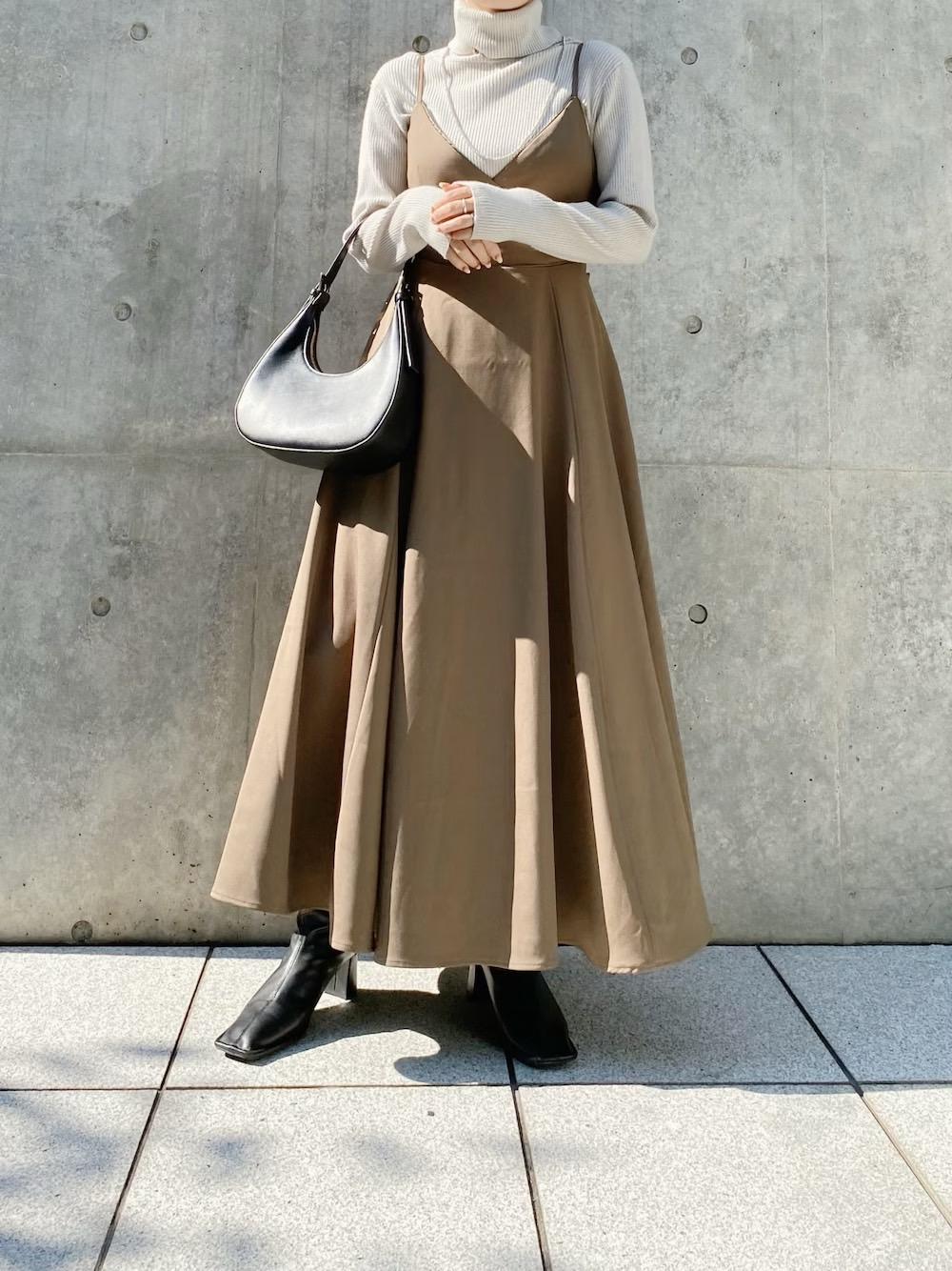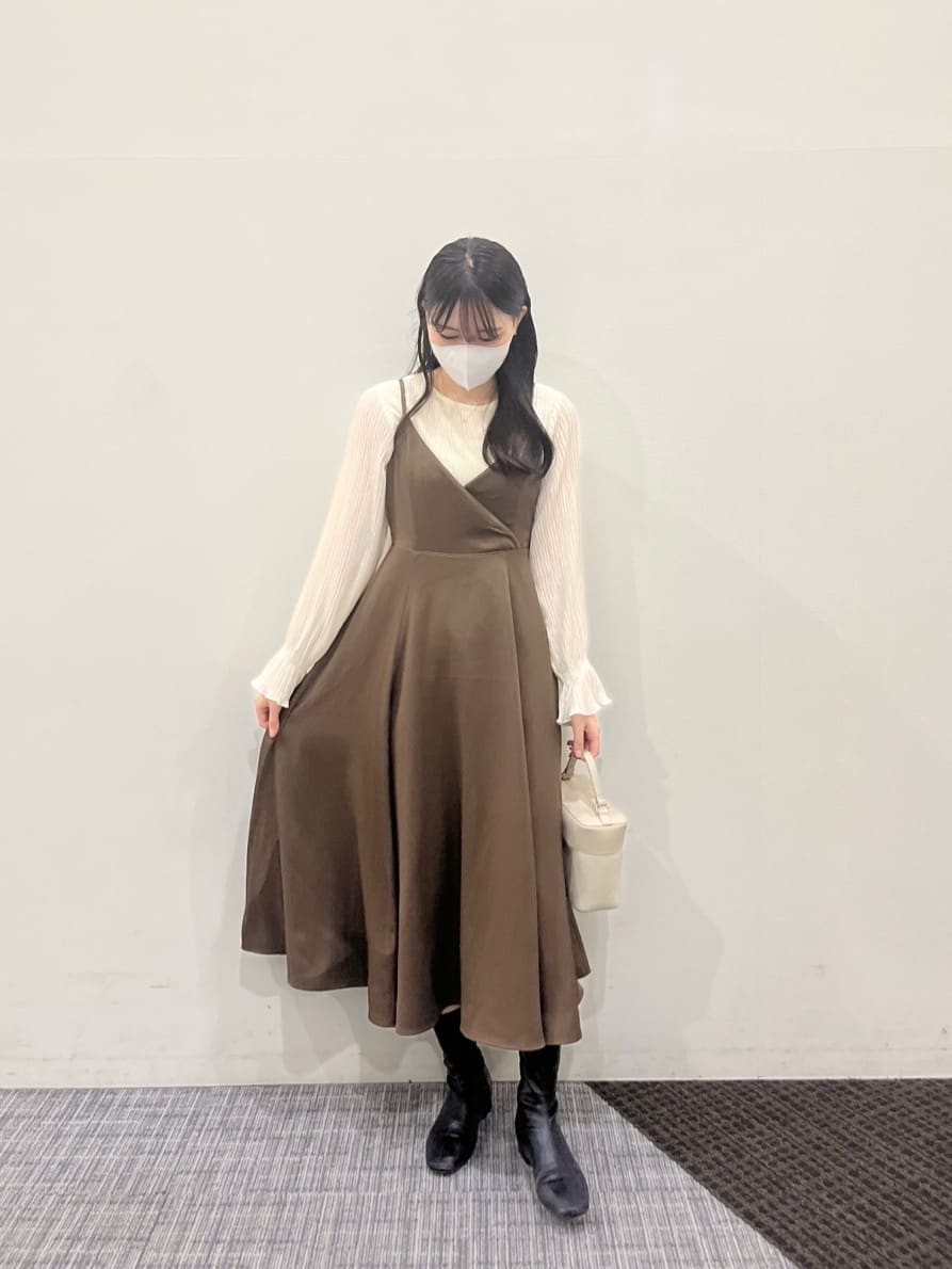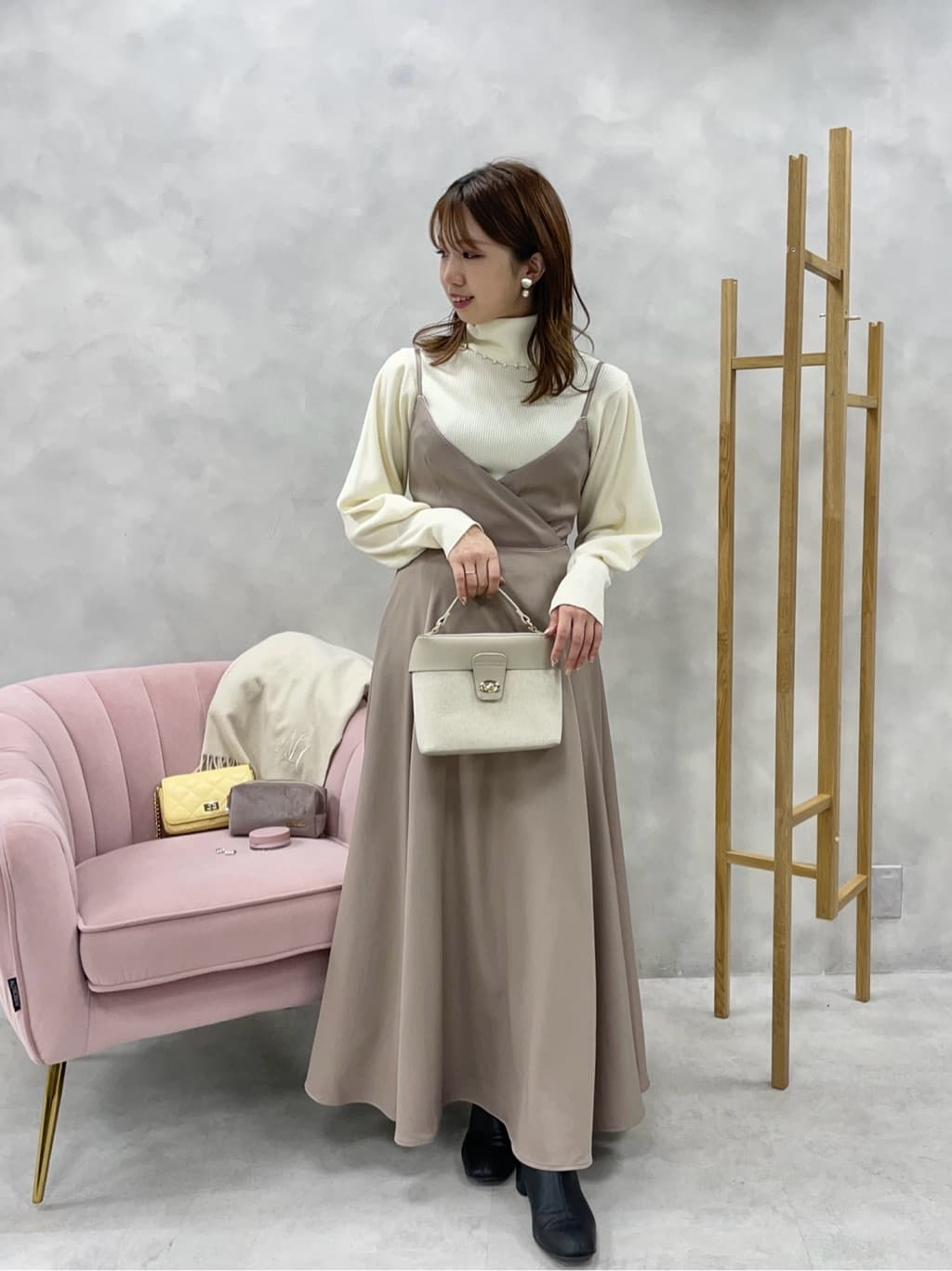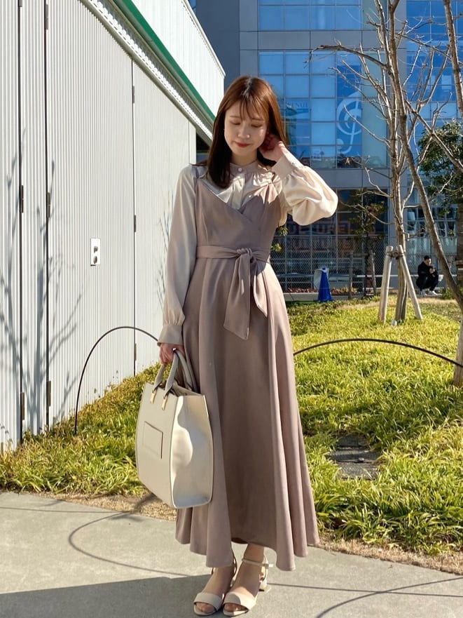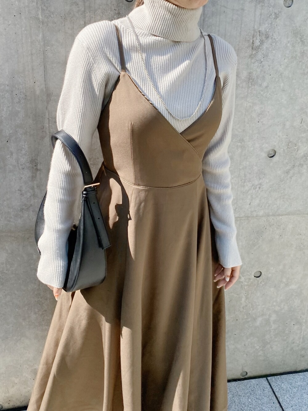 ショート丈のニットをワンピの上に着て、レイヤードスタイルでも秋冬らしく決まります。