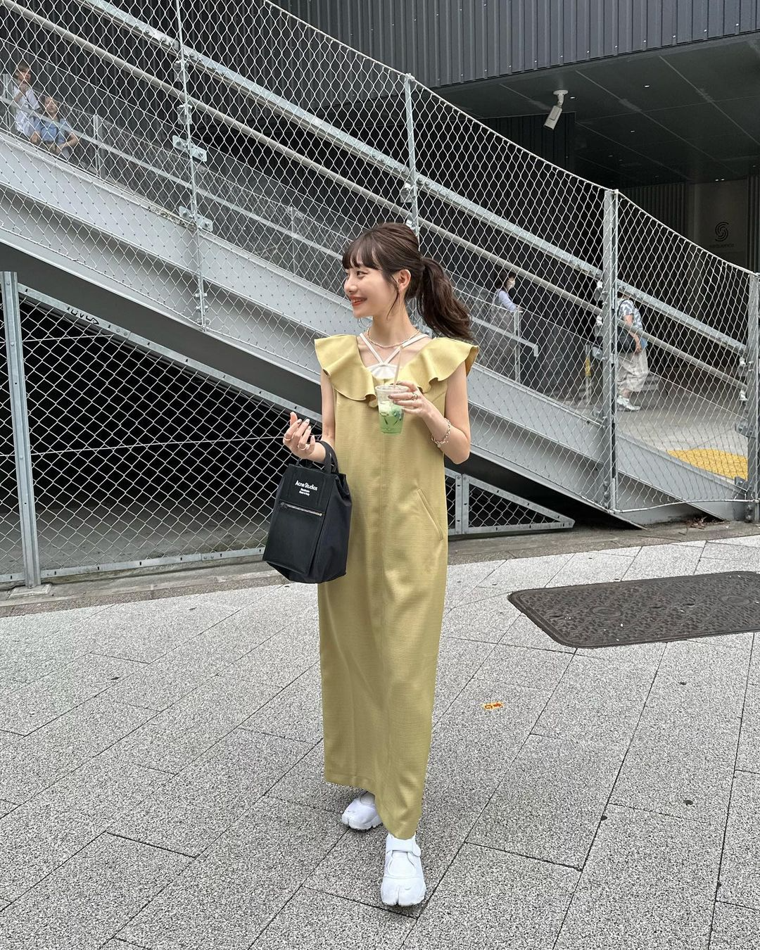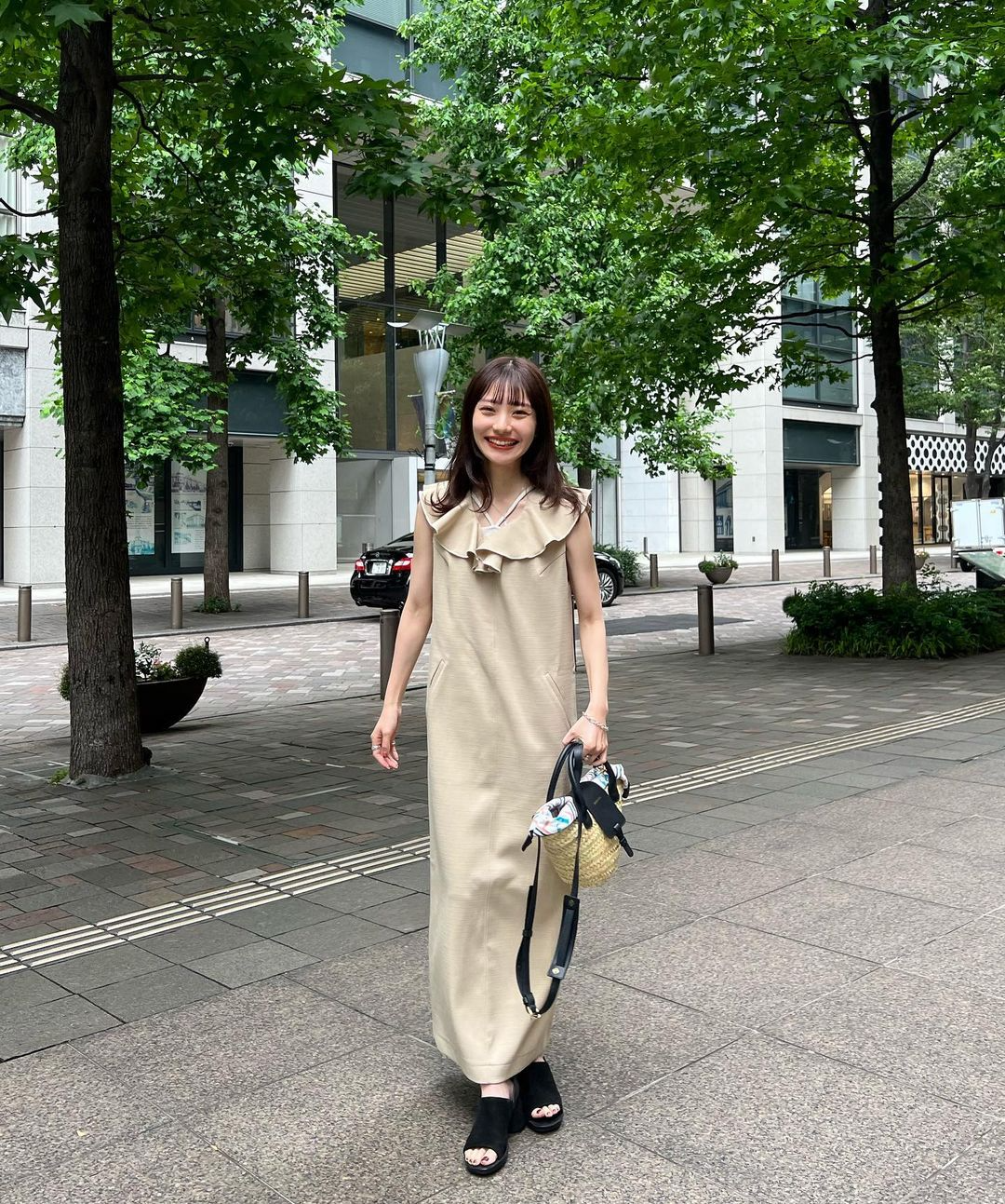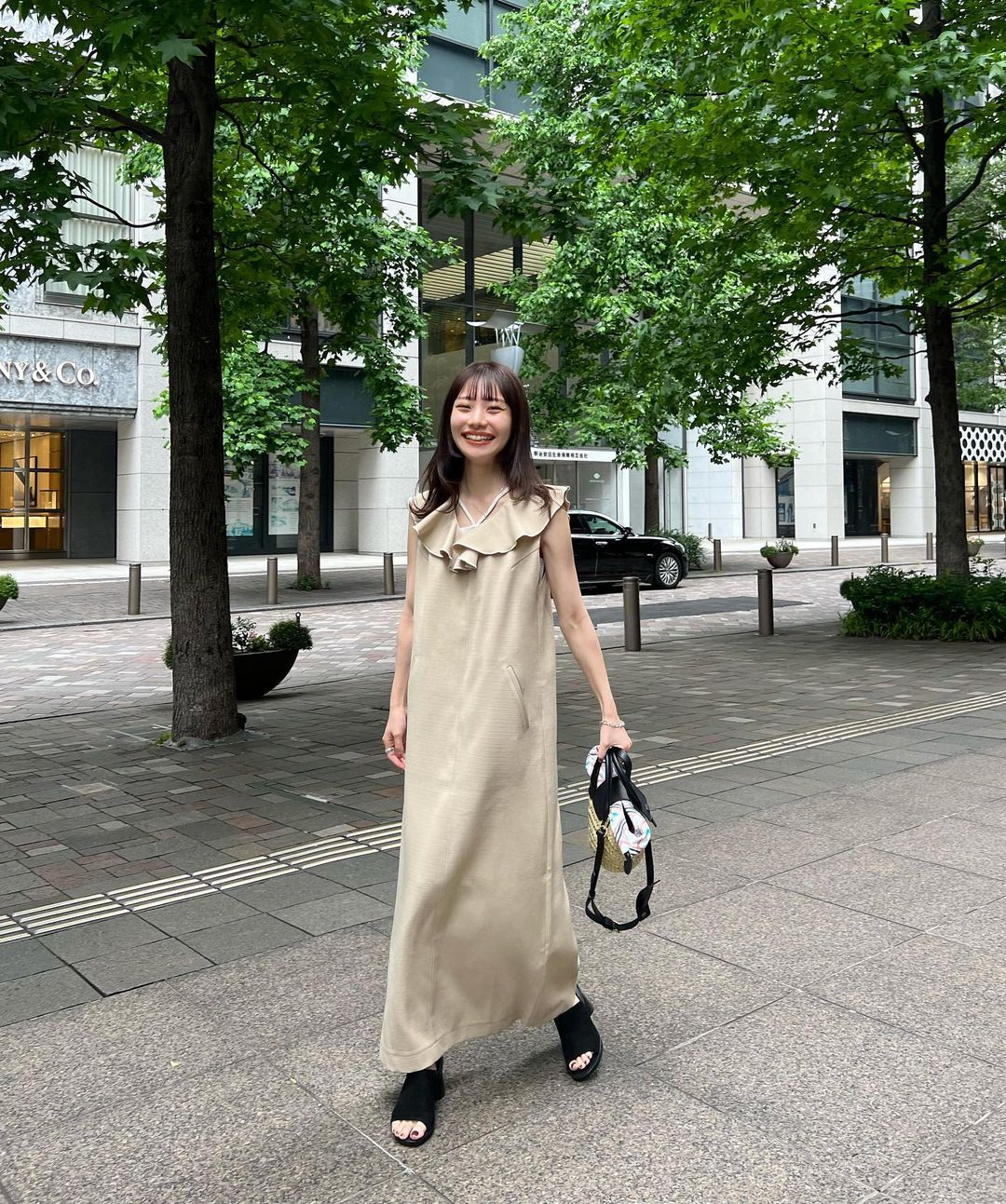 首元のフリルが印象的なIラインシルエットのワンピース。