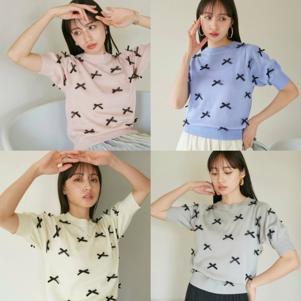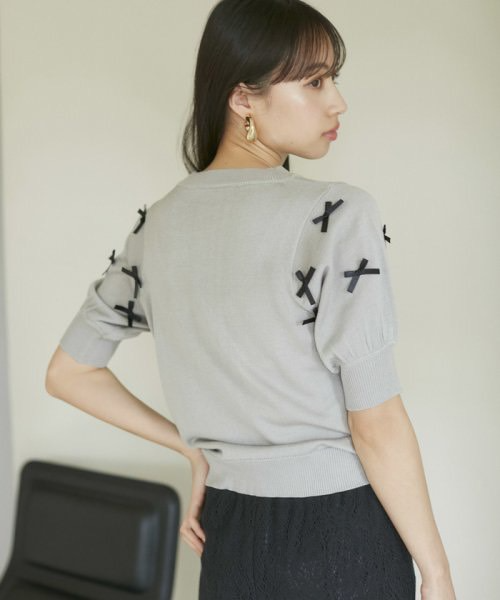 トレンドのリボンのモチーフをサテンリボンでデザインしたハーフスリーブニット。