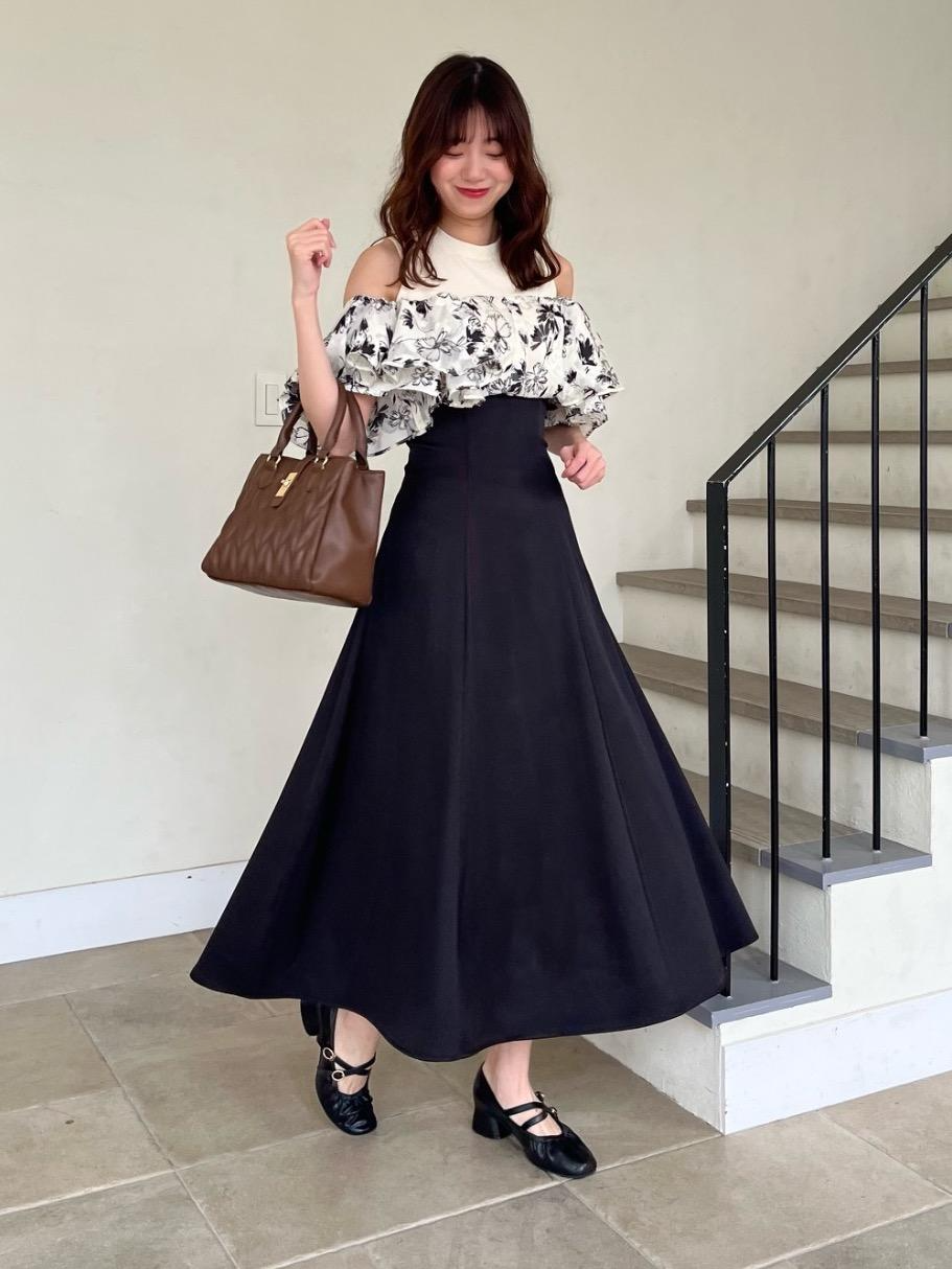 美しく広がるスカートシルエットにハイウエストでメリハリをつけスタイルアップ。
