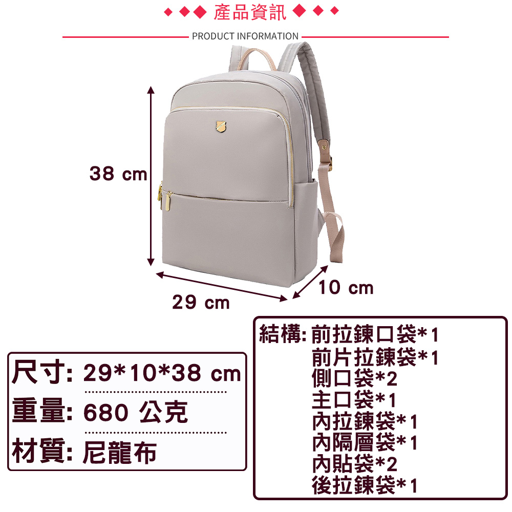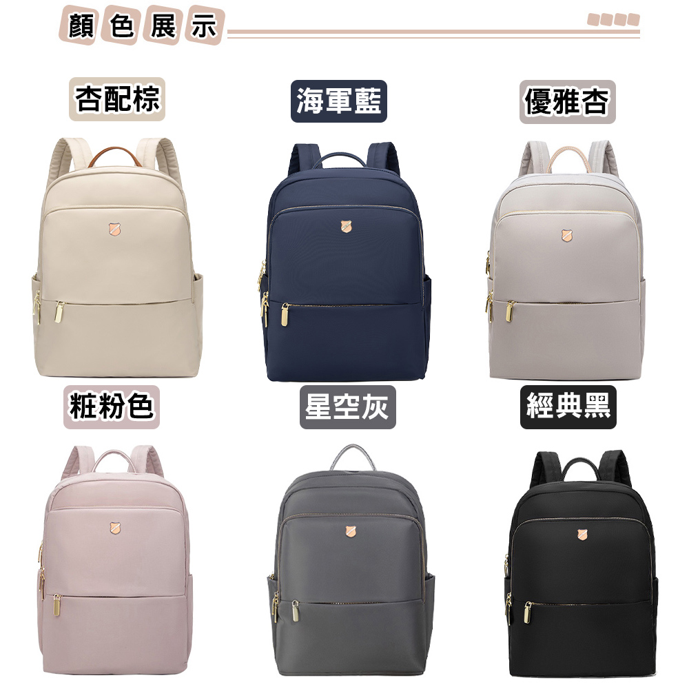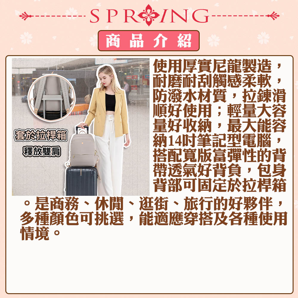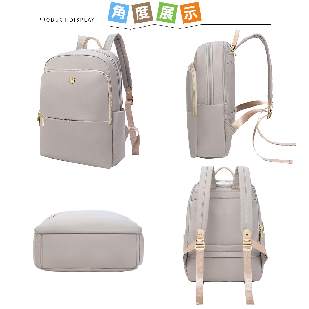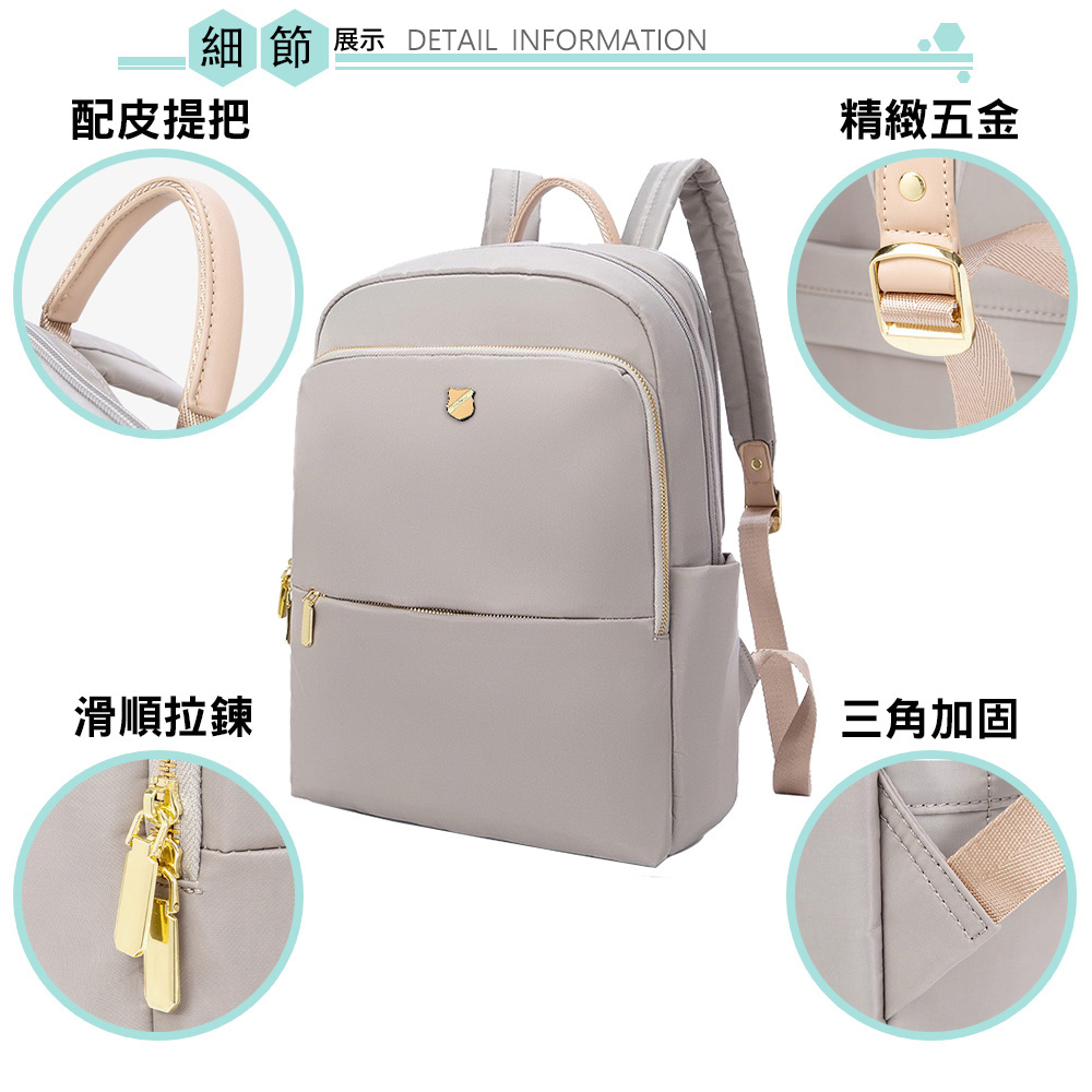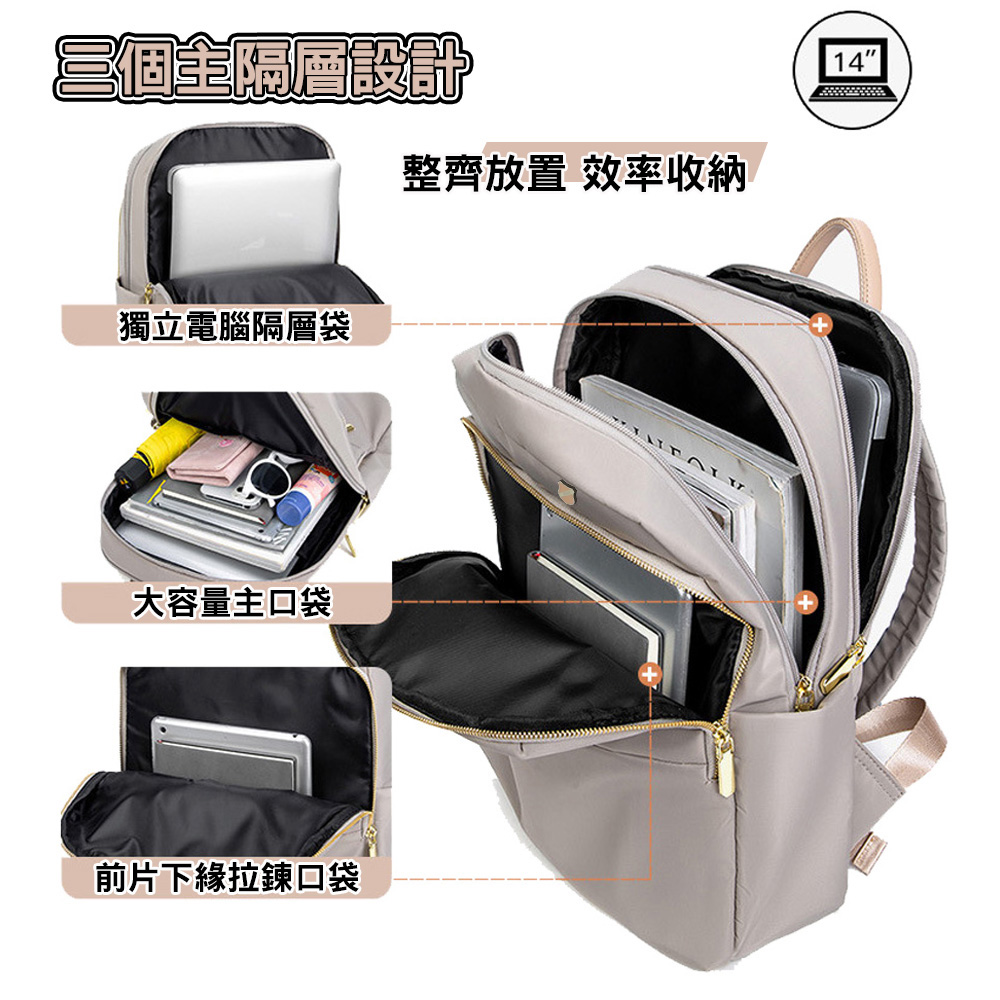 使用高級尼龍布製造,耐磨耐刮防潑水,抗變形,重量輕盈,3個主隔層設計,多口袋多收納空間; 透氣加厚雙肩帶,讓背負更有輕盈感;專屬14吋筆電收納防撞層,能穩當地保護電腦;旅行時,包身背後有設計可插於拉桿箱的固定帶,釋放雙肩的負擔;當上課書包、郊外踏青、逛街、商務通勤、旅行等都能符合使用需求。