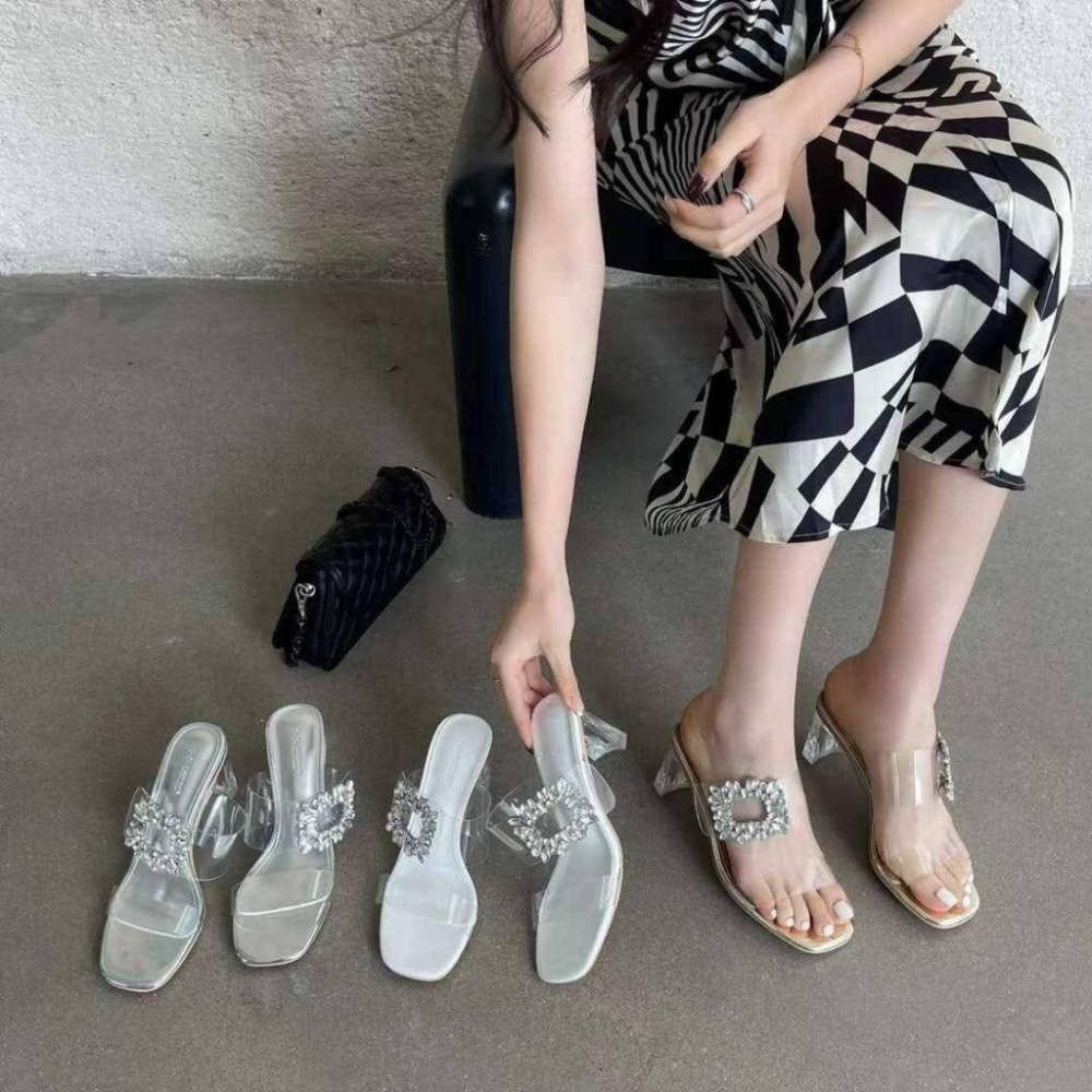 現貨銀色24.5一雙!! ⭐𝙈𝙖 𝙘𝙝𝙚𝙧𝙚⭐️ 現貨實拍 韓國透明高跟帶方鑽涼拖鞋 (預購)