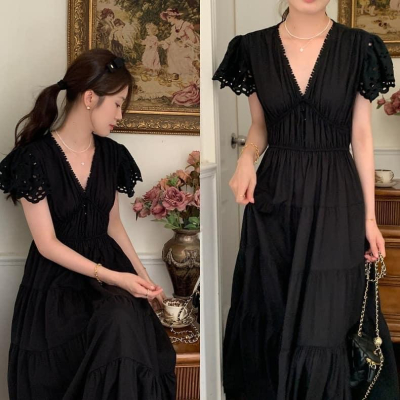 ⭐𝙈𝙖 𝙘𝙝𝙚𝙧𝙚⭐️ 現貨實拍 深V縷空緹花袖洋裝 (預購)