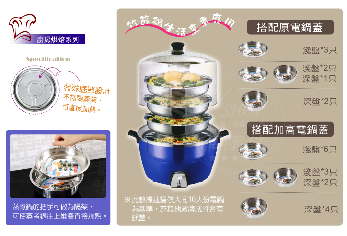 1)電鍋加高鍋蓋 + 通用蒸盤 + 10人份湯鍋