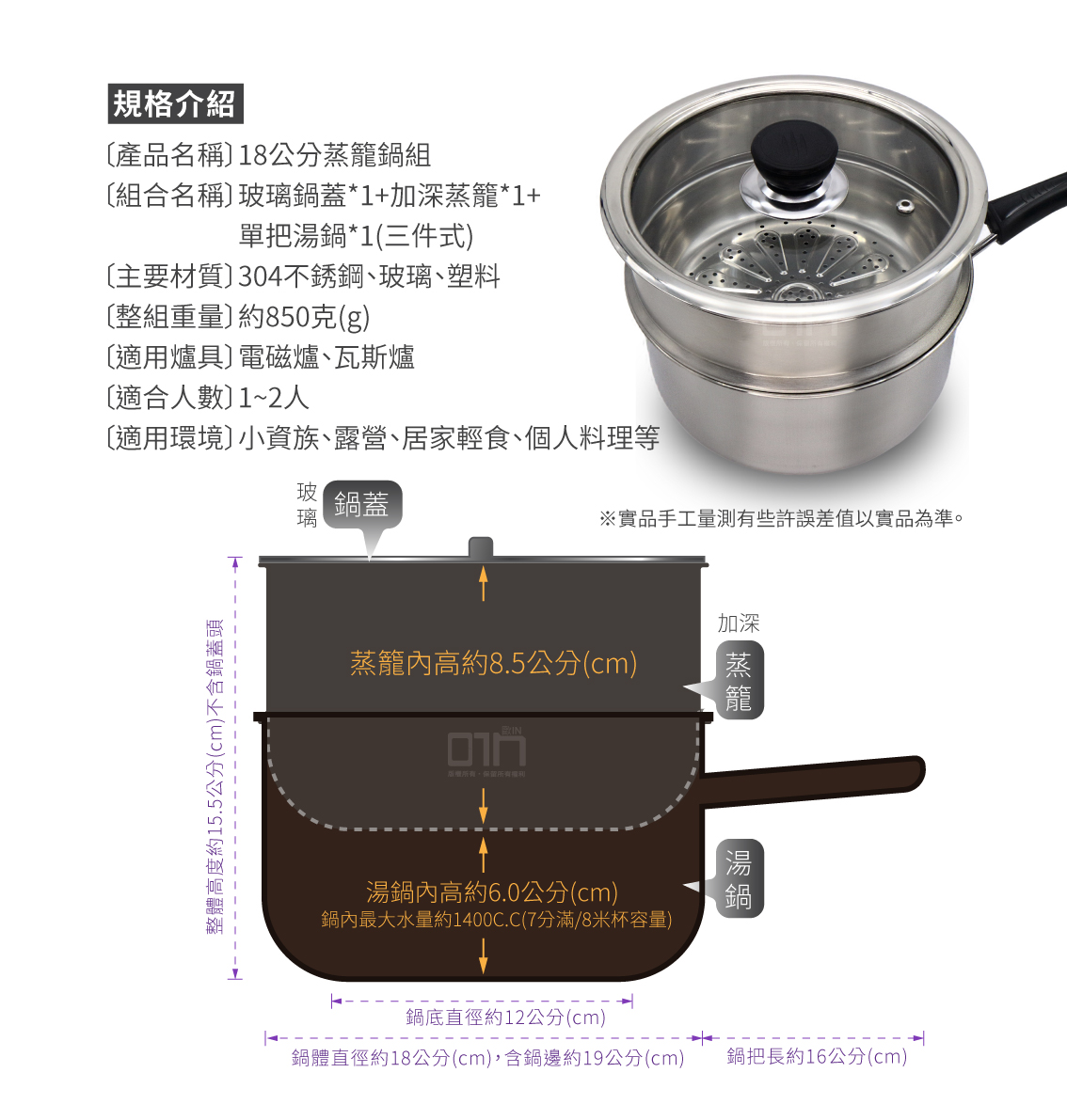 蒸籠直徑19,高9cm,湯鍋直徑19.2,高9.8cm,1400cc (8分滿)