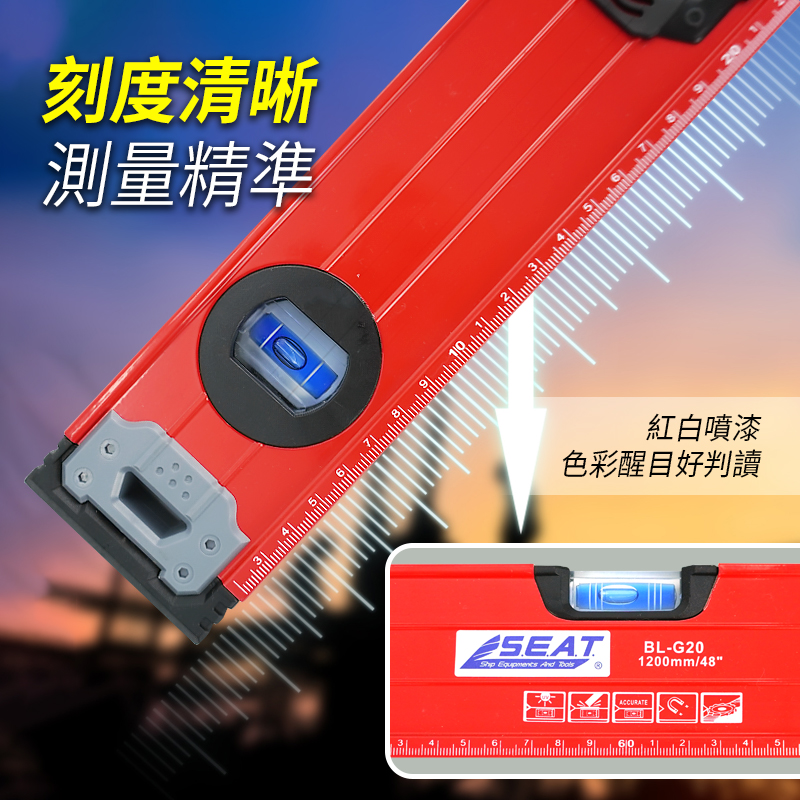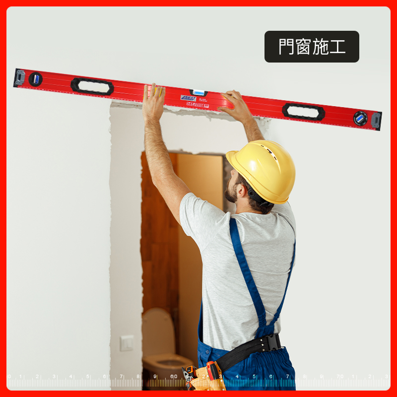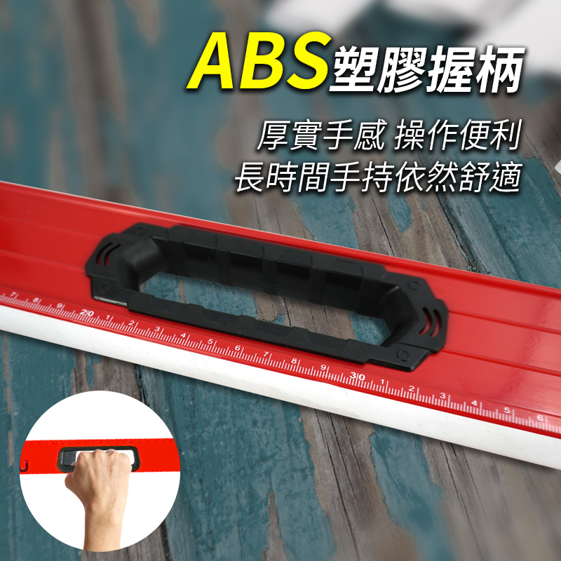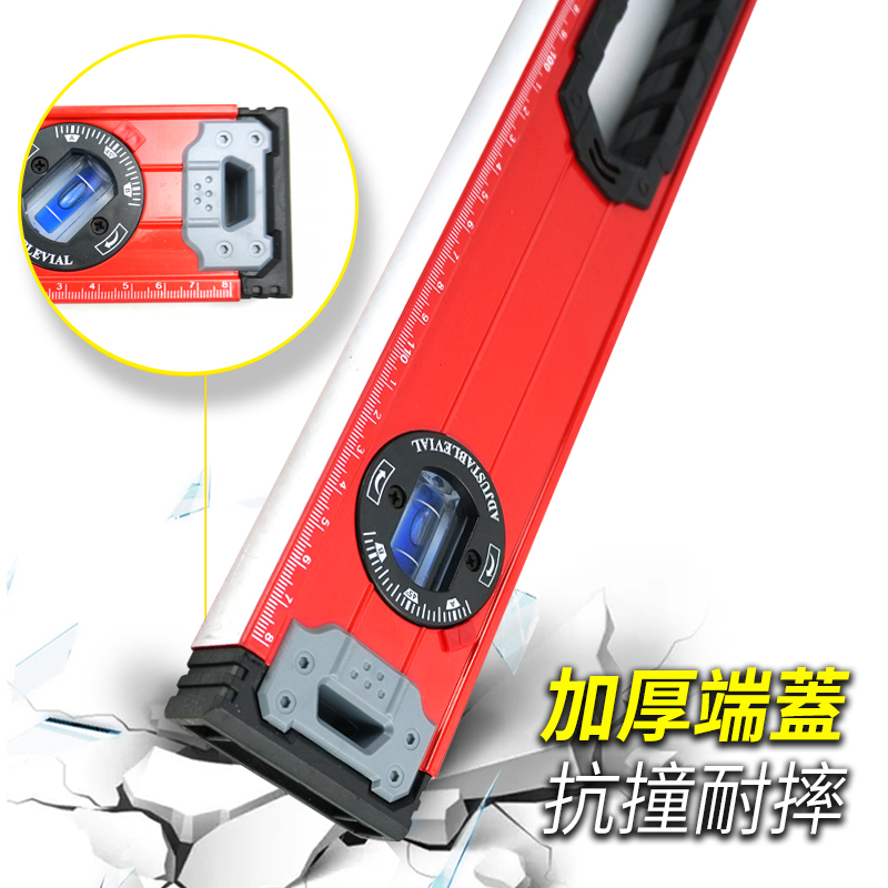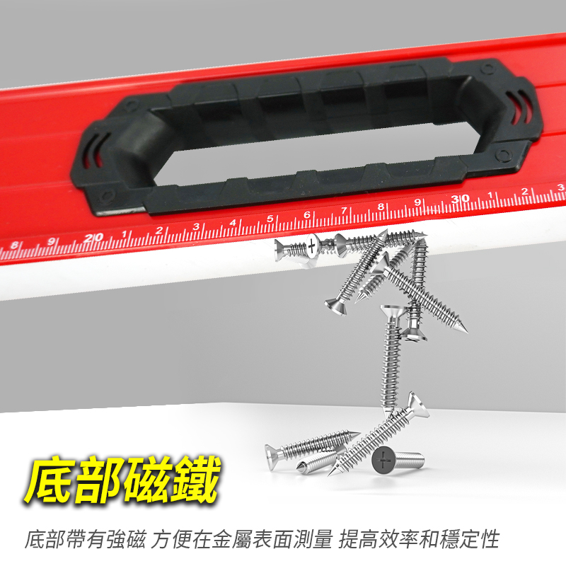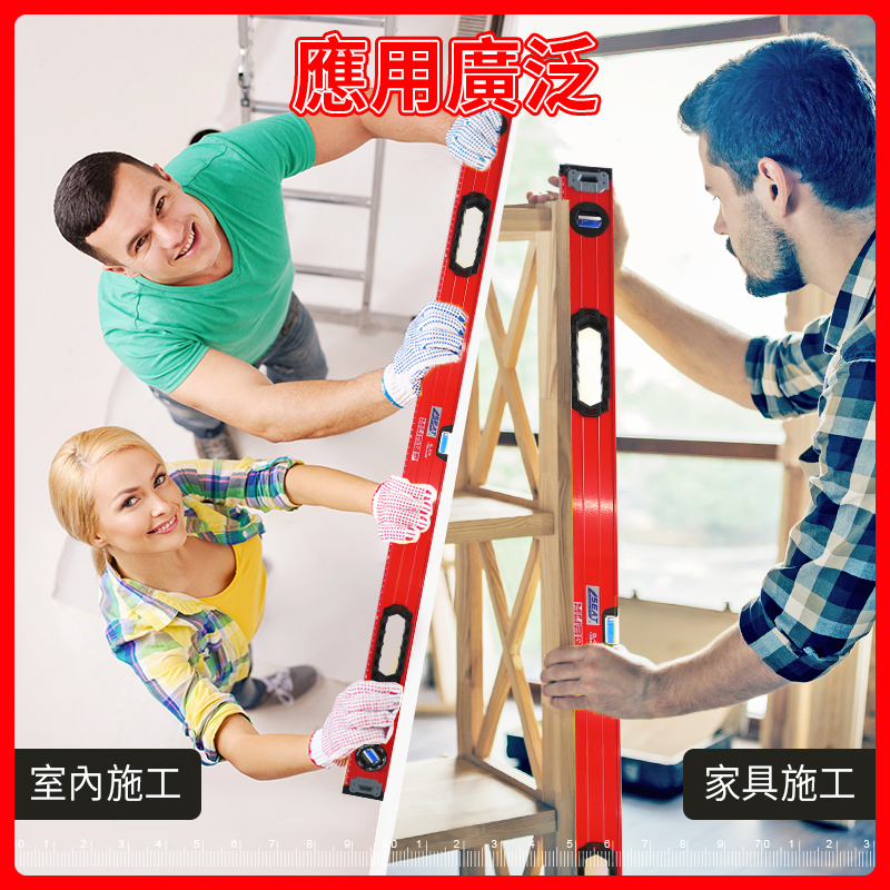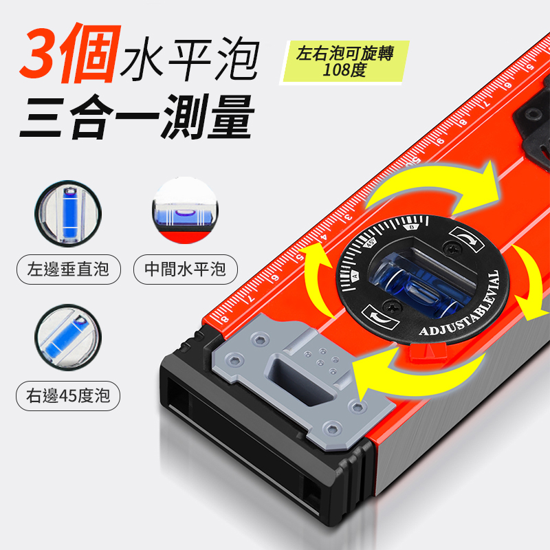 適用於工地測量、門窗施工測量水平度;採用高強度鋁合金製作,表面黃黑烤漆更容易判讀數字;尺上有3顆水平泡,分別用於觀測水平、垂直、45度;加厚端蓋保護尺身不易摔壞;底部有磁鐵可吸附在金屬材質上更方便作業。