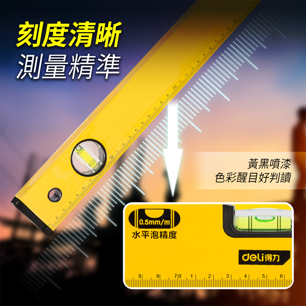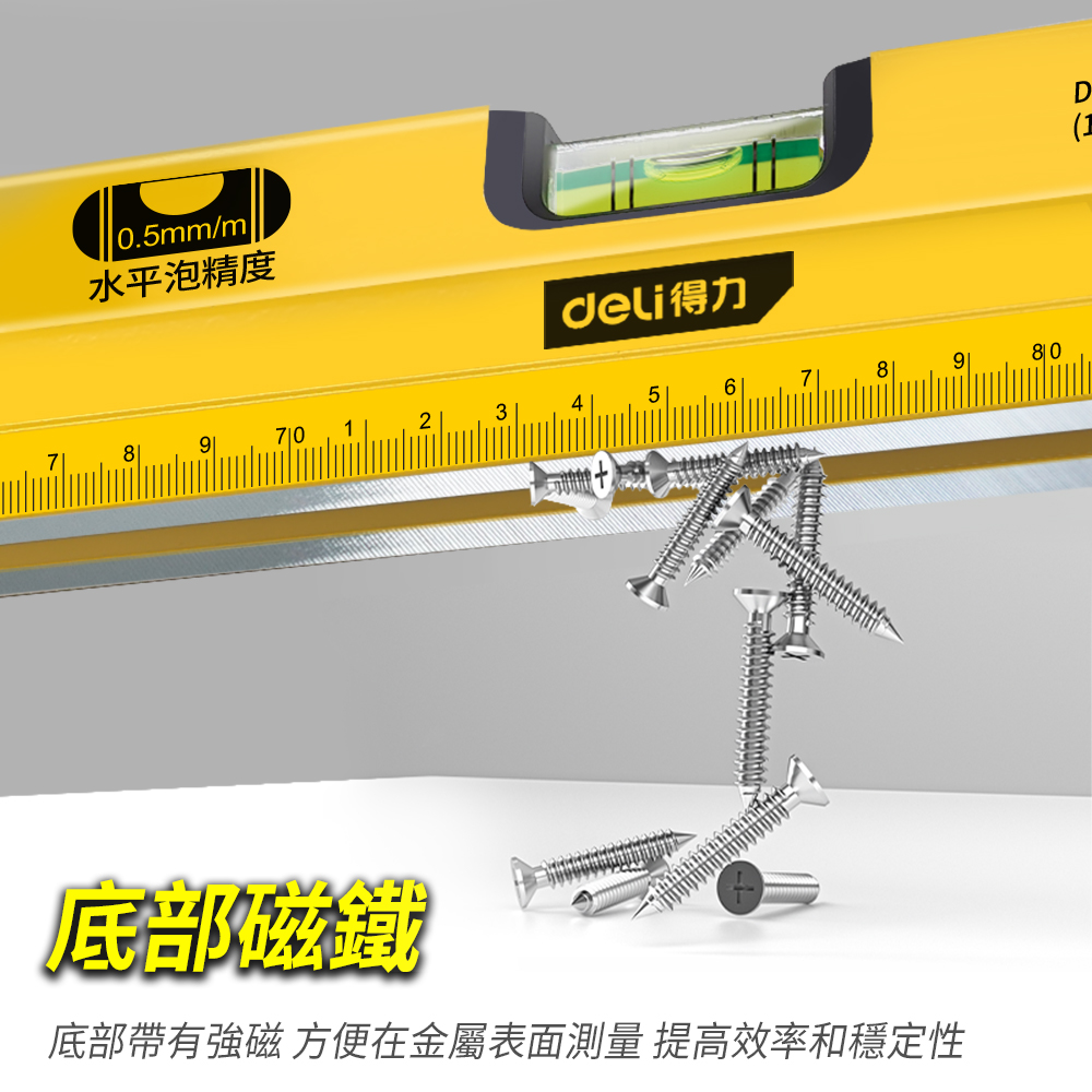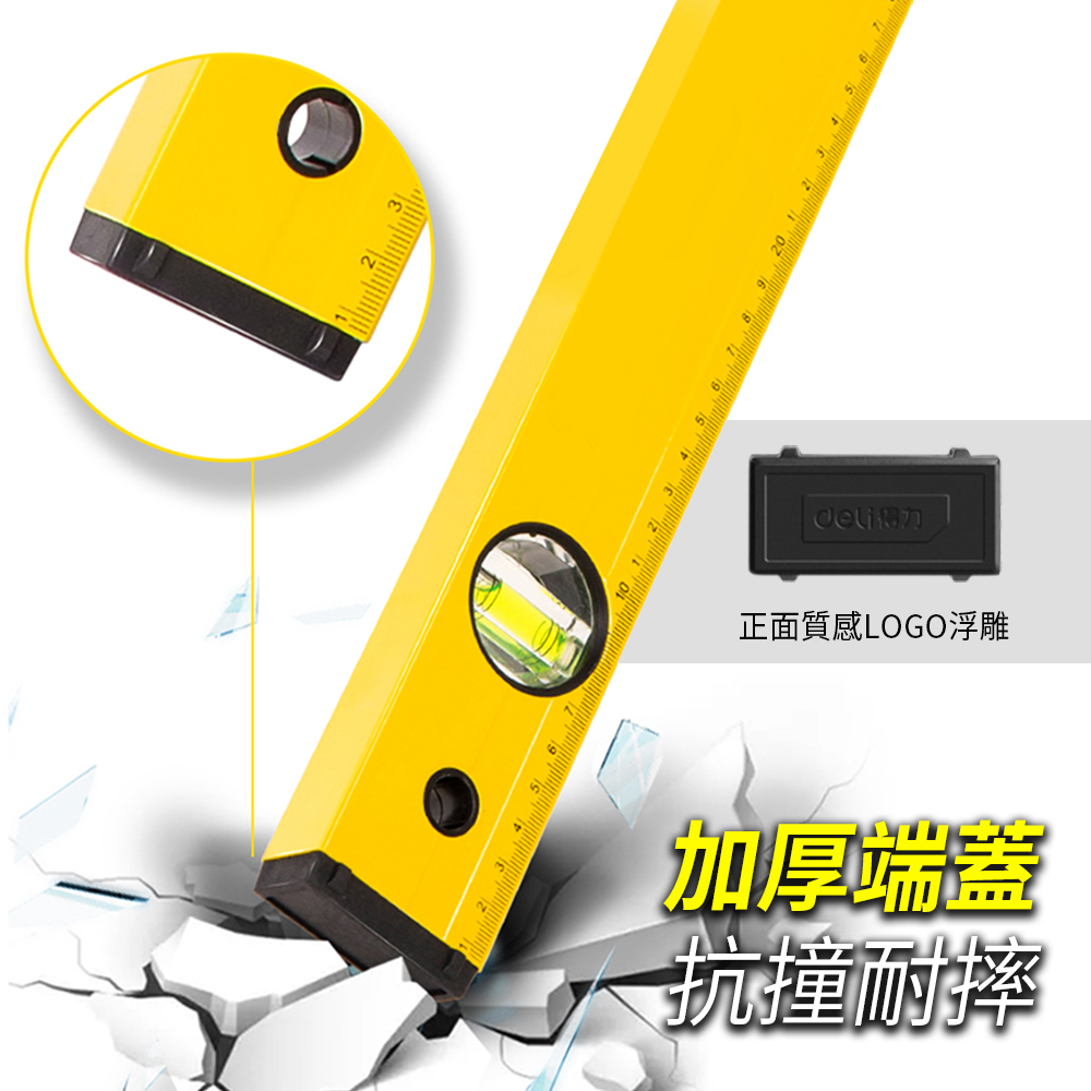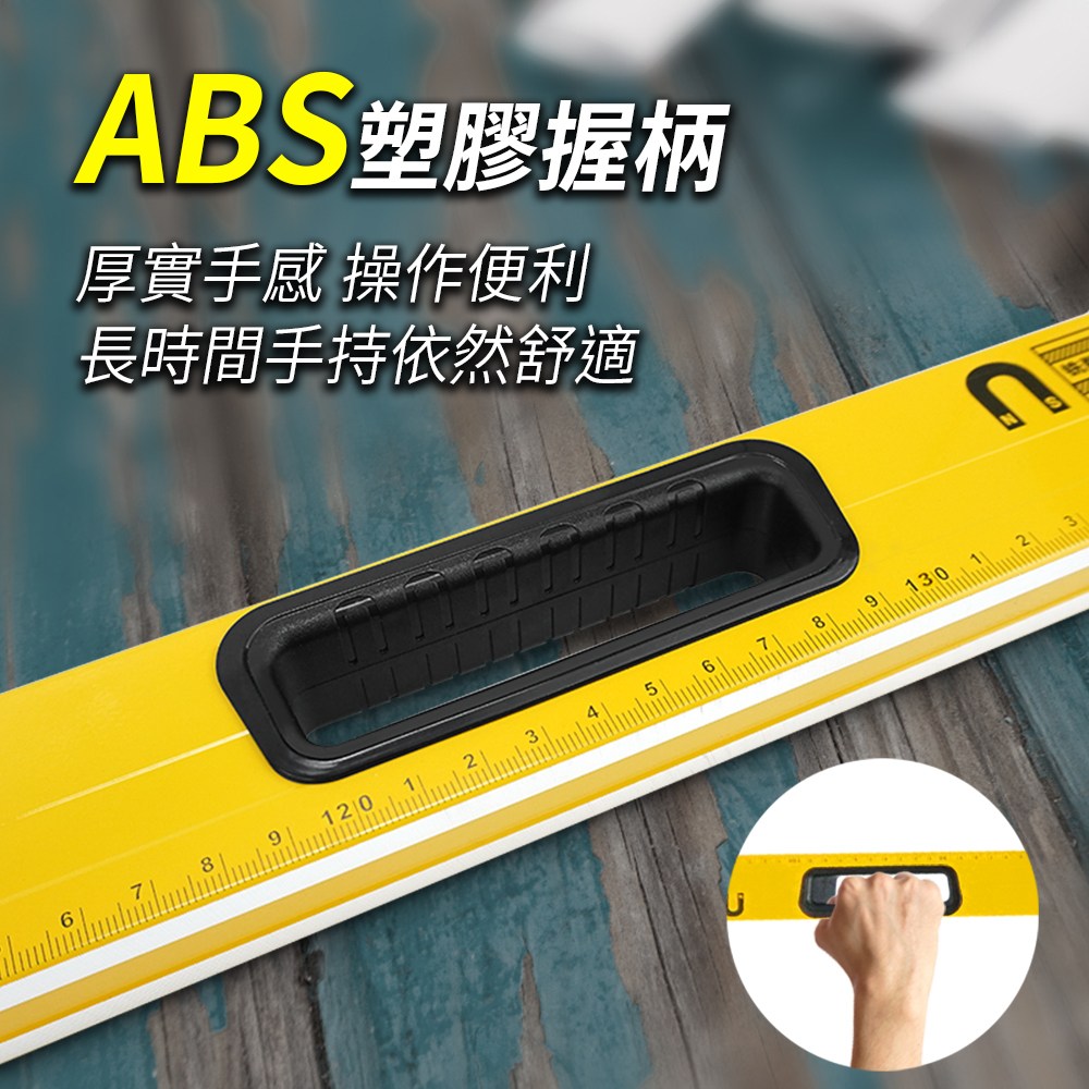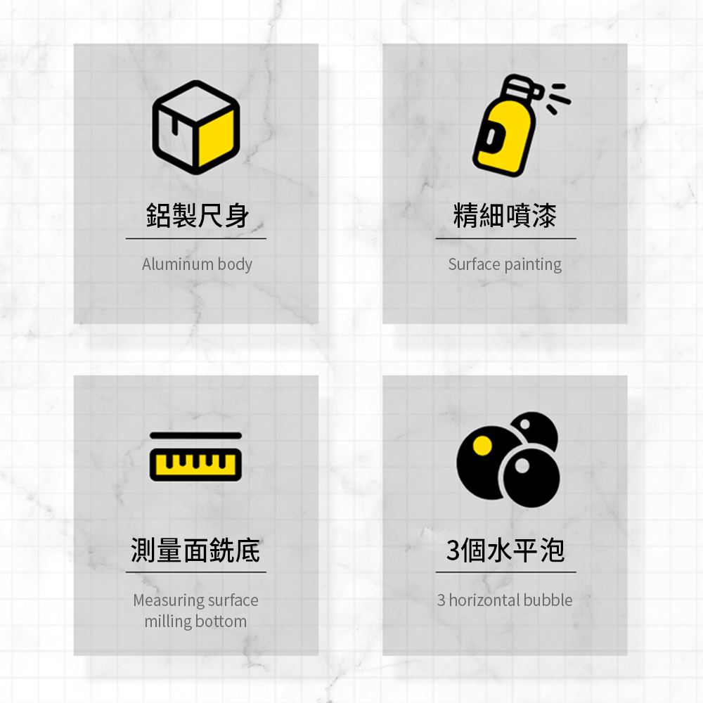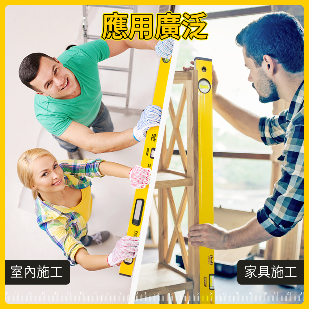 適用於工地測量、門窗施工測量水平度;採用高強度鋁合金製作,表面黃黑烤漆更容易判讀數字;尺上有3顆水平泡,分別用於觀測水平、垂直、45度;加厚端蓋保護尺身不易摔壞;底部有磁鐵可吸附在金屬材質上更方便作業。