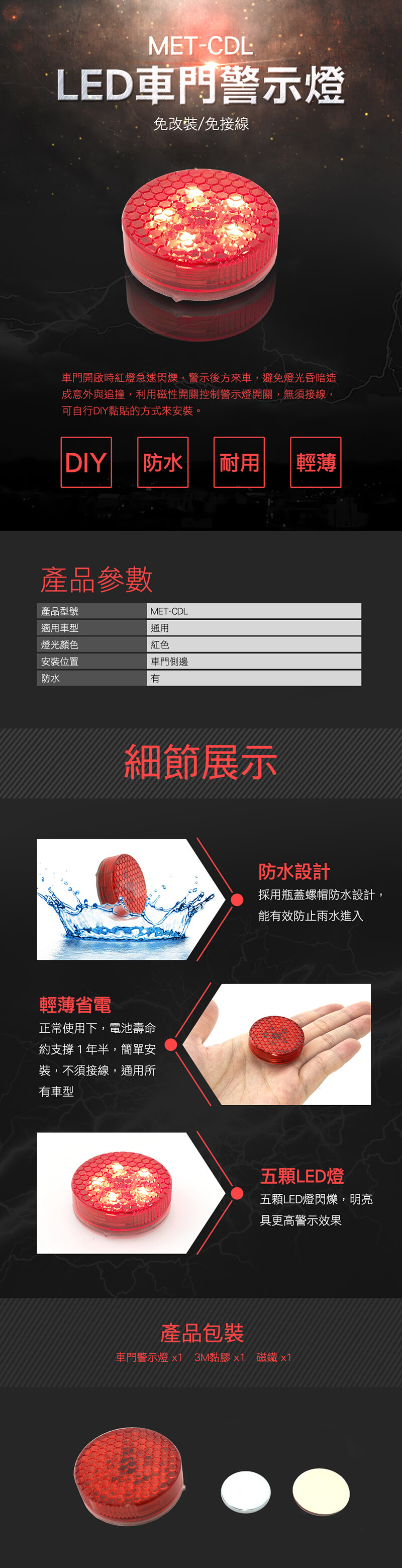 商品內容:警示燈*2(兩個一包裝,非雙數無法出貨)、說明書、3M膠貼