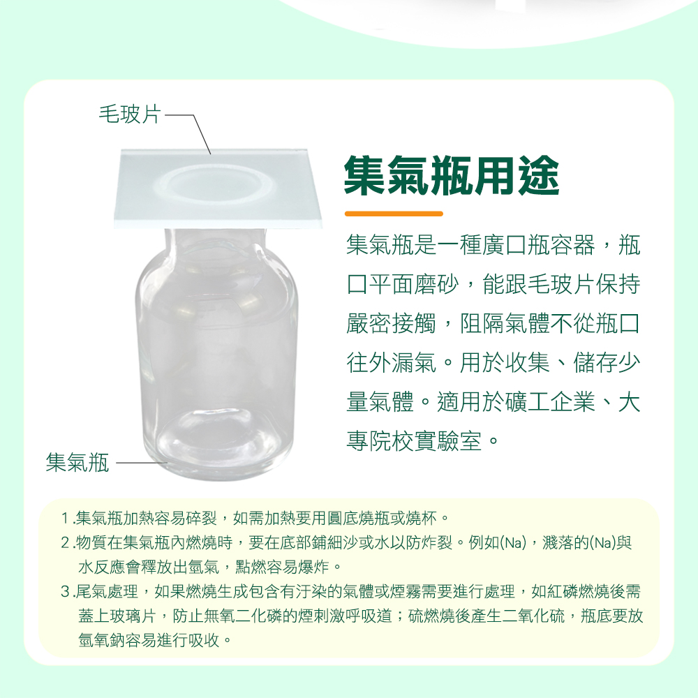 集氣瓶是一種廣口瓶容器,瓶口平面磨砂,能跟毛玻片保持嚴密接觸,阻隔氣體不從瓶口往外漏氣。用於收集、儲存少量氣體。適用於礦工企業、大專院校實驗室。