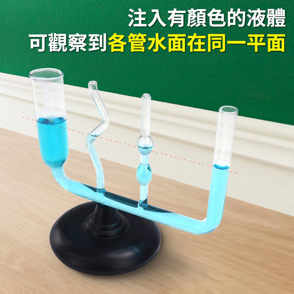 液體連通管是一種科學教具,可以用來向學生示範連通管原理。注入有顏色的液體,可觀察到各玻璃管的液體平面成一直線。架設快速容易,讓學生清楚理解觀念。