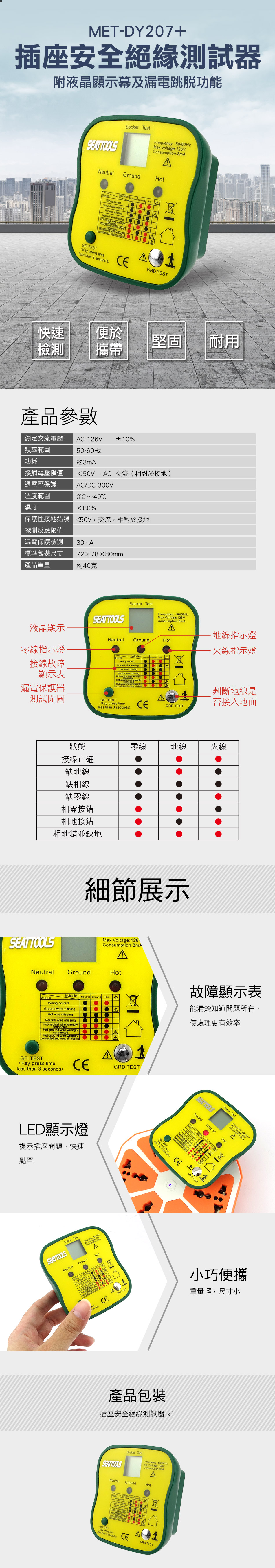 《利器》插座安全絕緣測試器 漏電跳脫 三線測試 地線零線火線 插座測試 接線狀態 插檢器 驗電器 驗屋 DY207+