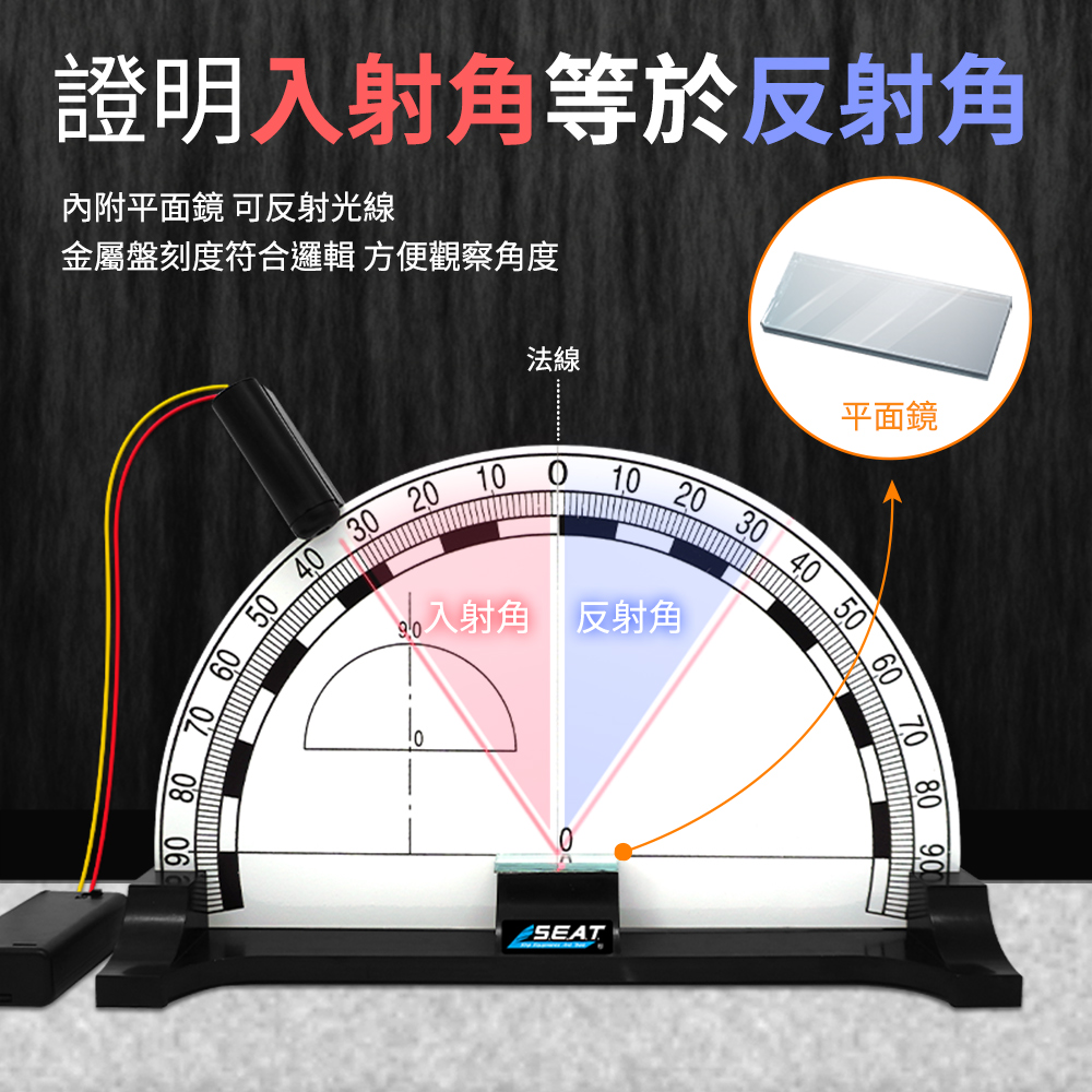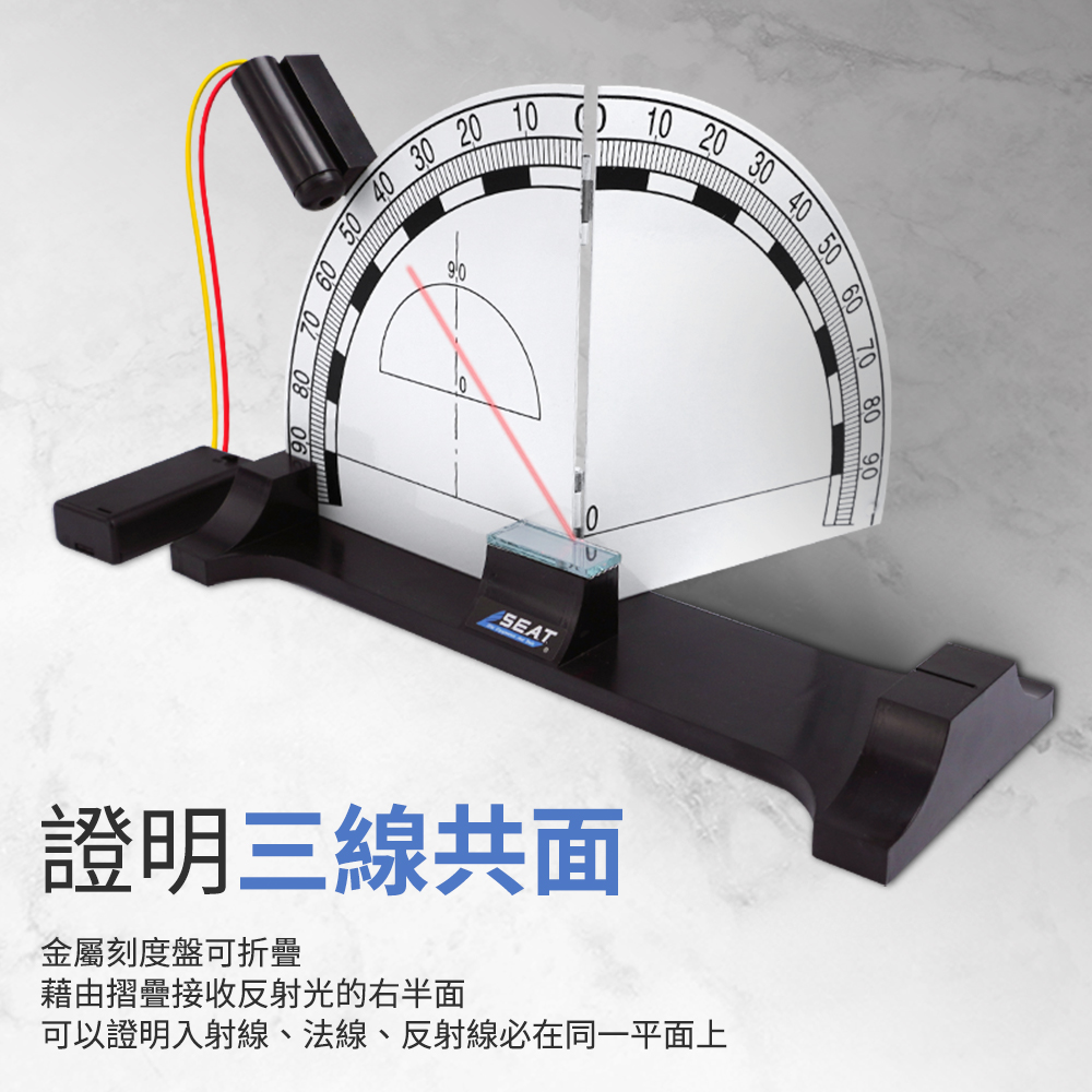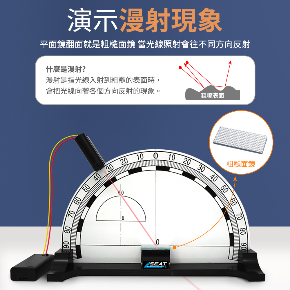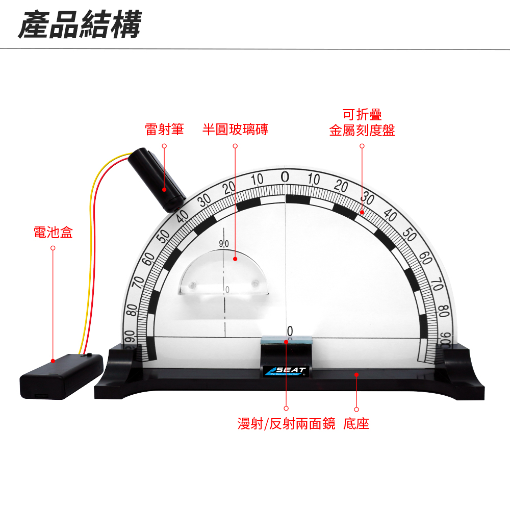 光的折射實驗器是一種科學教具,可以用來向學生示範反射與折射定律。搭配平面鏡使用可以示範反射現象、證明入射角等於反射角;平面鏡背面為粗糙面鏡,可以示範漫射現象;搭配玻璃磚可以展示折射現象。組裝快速容易,讓學生清楚理解觀念。