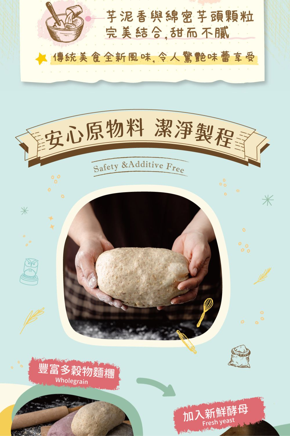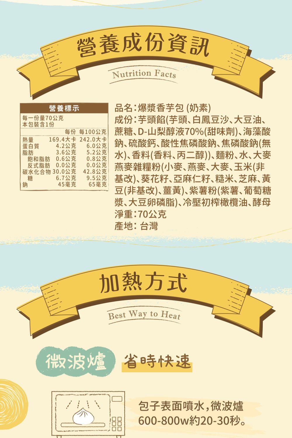 商品成分:芋頭餡(芋頭、白鳳豆沙、大豆油、蔗糖、D-山梨醇液70%(甜味劑)、海藻酸鈉、硫酸鈣、酸性焦磷酸鈉、焦磷酸鈉(無水)、香料(香料、丙二醇))、麵粉、水、大麥燕麥雜糧粉(小麥、燕麥、大麥、玉米(非基改)、葵花籽、亞麻仁籽、糙米、芝麻、黃豆(非基改)、薑黃)、紫薯粉(紫薯、葡萄糖漿、大豆卵磷脂)、冷壓初榨橄欖油、酵母